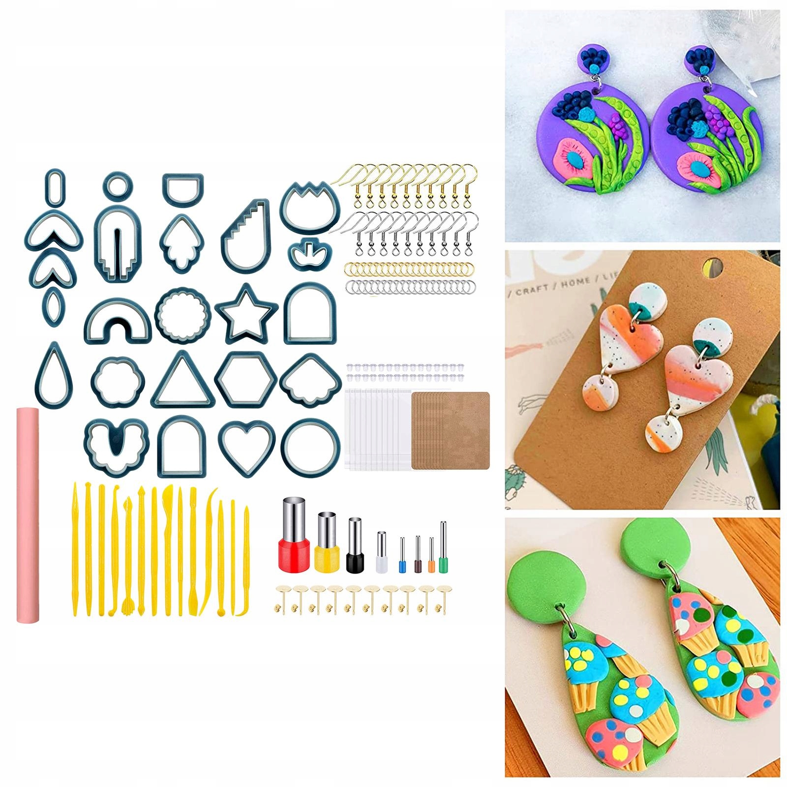 Различные формы и размеры: в комплект входят 24 формочки для сережек различной формы, 10 наборов карточек для сережек и самозакрывающихся пакетов, 10 наборов серег, 20 крючков для сережек, 30 переходных колец, 30 серег и 8 колец для формовки, 1 шт. Валик xClay, 14 мини-инструментов для высечки.
