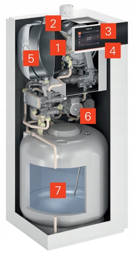 Vitodens 222-F гарантирует высокий комфорт горячей воды и обеспечивает -В резервуаре для горячей воды. с послойной загрузкой емкостью 100 литров, встроенный под корпус котла.
