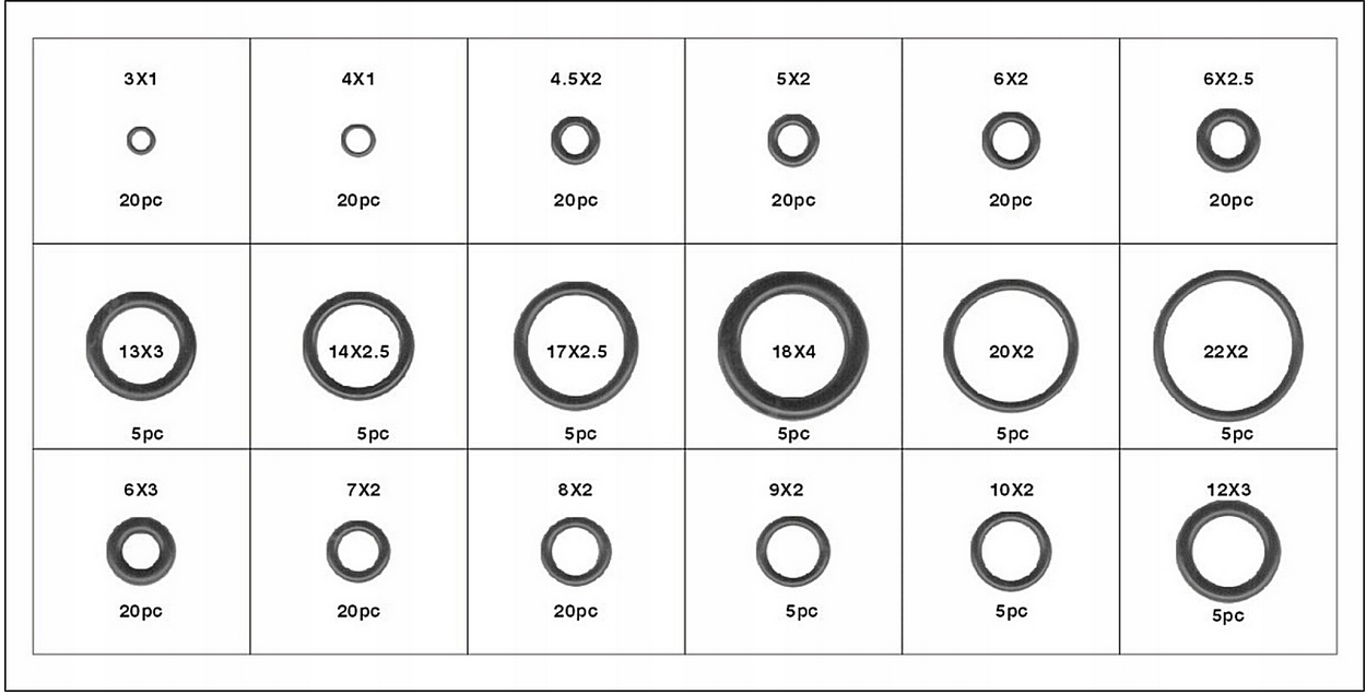 o-ring x225 (Ø3x1 мм x20, Ø4x1 мм x20, Ø4,5x2 мм x20, Ø5x2 мм x20, Ø6x2 мм x20, Ø6x2,5 мм x20, Ø6x3 мм x20, ø6x2,5 мм x20, Ø6x3 мм, ø6x2 мм. x20, x20, Ø9x2 мм x5, Ø10x2 мм x5, Ø12x3 мм x5, Ø13x3 мм x5, Ø14x2,5 мм x5, 17x2,5 мм x5, 18x4 мм X5, 20x2 мм x5, 22x2 мм x5).