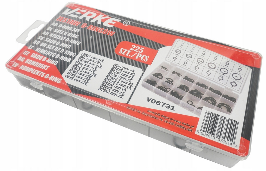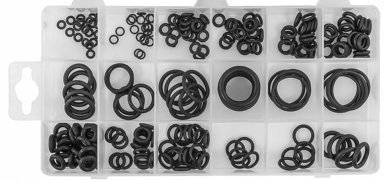 уплотнительные кольца 225 шт. Содержит смесь из 18 различных размеров. Уплотнительные кольца изготовлены из резинового устойчивости к агрессивным факторам, таким как топливо, масла и химикаты и высокая температура. Практическая упаковка обеспечивает легкий доступ к удобному размеру.