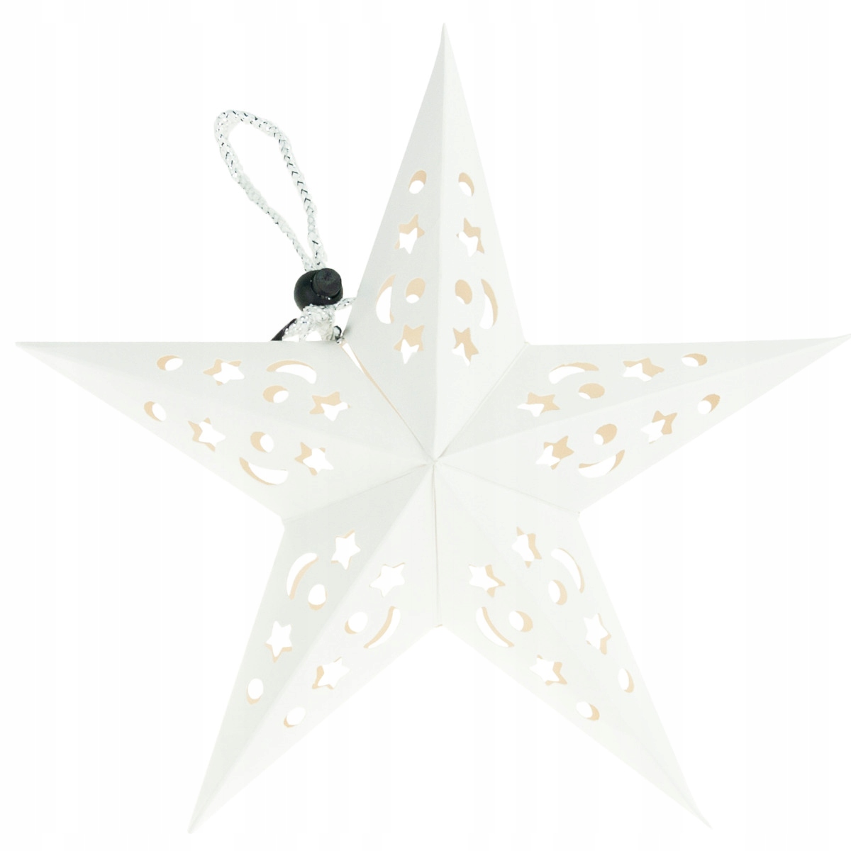 Рождественские украшения – это не только елка, украшенная игрушками и огоньками. Одним из таких уникальных рождественских украшений является эта красивая бумажная звезда. Он изготовлен из жесткого картона, поэтому легко держит форму. Можно повесить на люстру или потолок. Он прекрасно смотрится, подвешенный на окне на карнизе – его видно как внутри, так и снаружи квартиры. На поверхности ажурный узор с мелкими звездочками. Для подвешивания используется белая веревка.