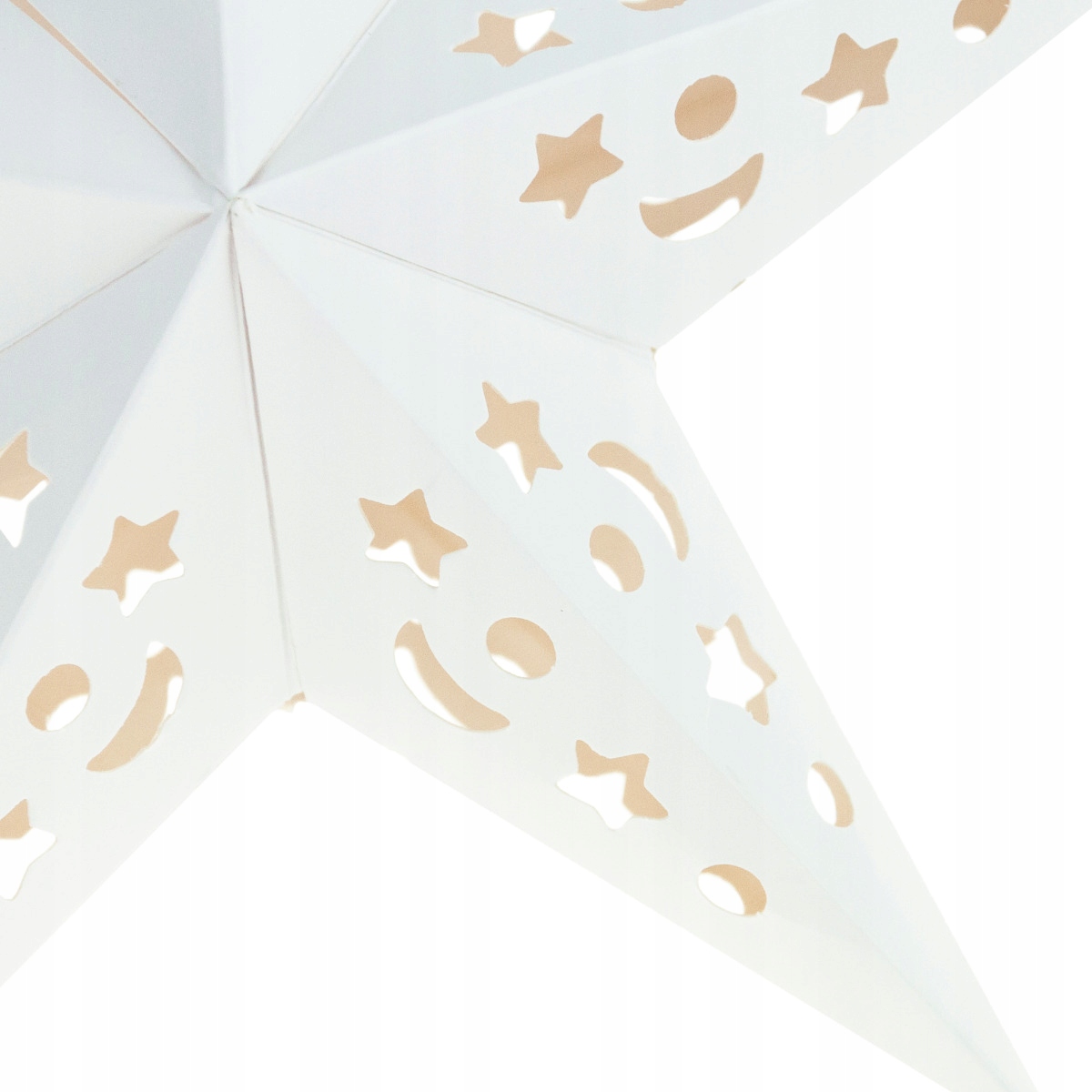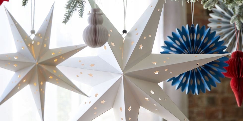 Новогодние украшения – это не только елка, украшенная игрушками и огоньками. Одним из таких уникальных рождественских украшений является красивая бумажная звезда. Он изготовлен из жесткого картона, поэтому легко сохраняет форму. Мы можем повесить его на люстру или потолок. Он отлично смотрится, подвешенный в окне на карнизе – его видно как внутри, так и снаружи квартиры. На поверхности ажурный узор с мелкими звездочками. Для подвешивания используется белая веревка.