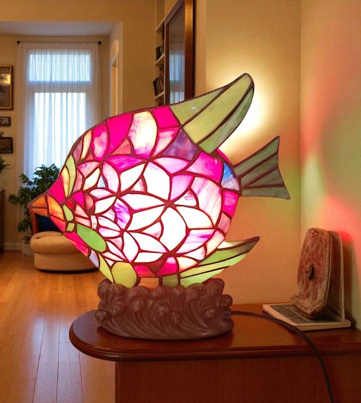 Стильная витража h1> лампа, привезенная из Франции. Он представляет красочное витражное окно в виде рыбы. Это создаст уникальную атмосферу в каждой комнате; стильный и современный. h1> Лампа имеет одну световую точку для лампы с потоком E-14 (так называемая маленькая нить). h1>