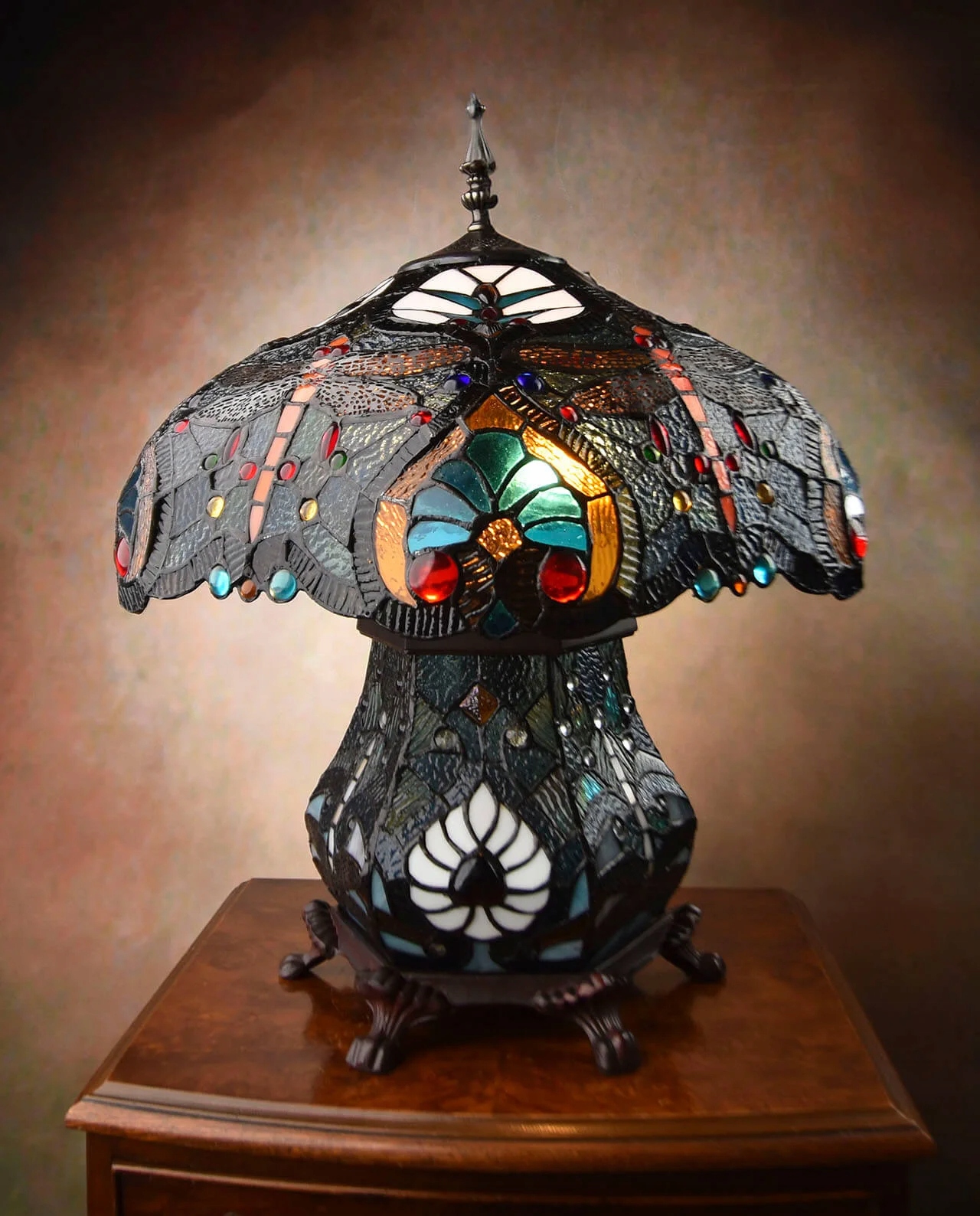 Вітражна лампа в стилі Тіффані з сяючою темно-синьою основою бабки