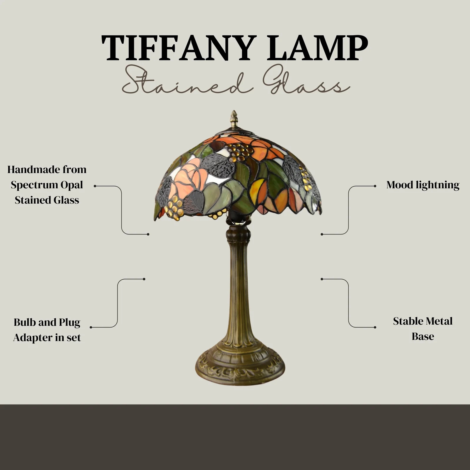 Красивая настольная лампа в стиле Тиффани с абажуром, изображающим мотив осеннего сада. Уникальная большая лампа с витражным абажуром и металлическим основанием. Выполнено из эксклюзивных материалов - стекла и перламутра, очень аккуратно, с вниманием к мельчайшим деталям. Вся конструкция выполнена из металла. В комплект входит энергосберегающая лампочка класса АА++.