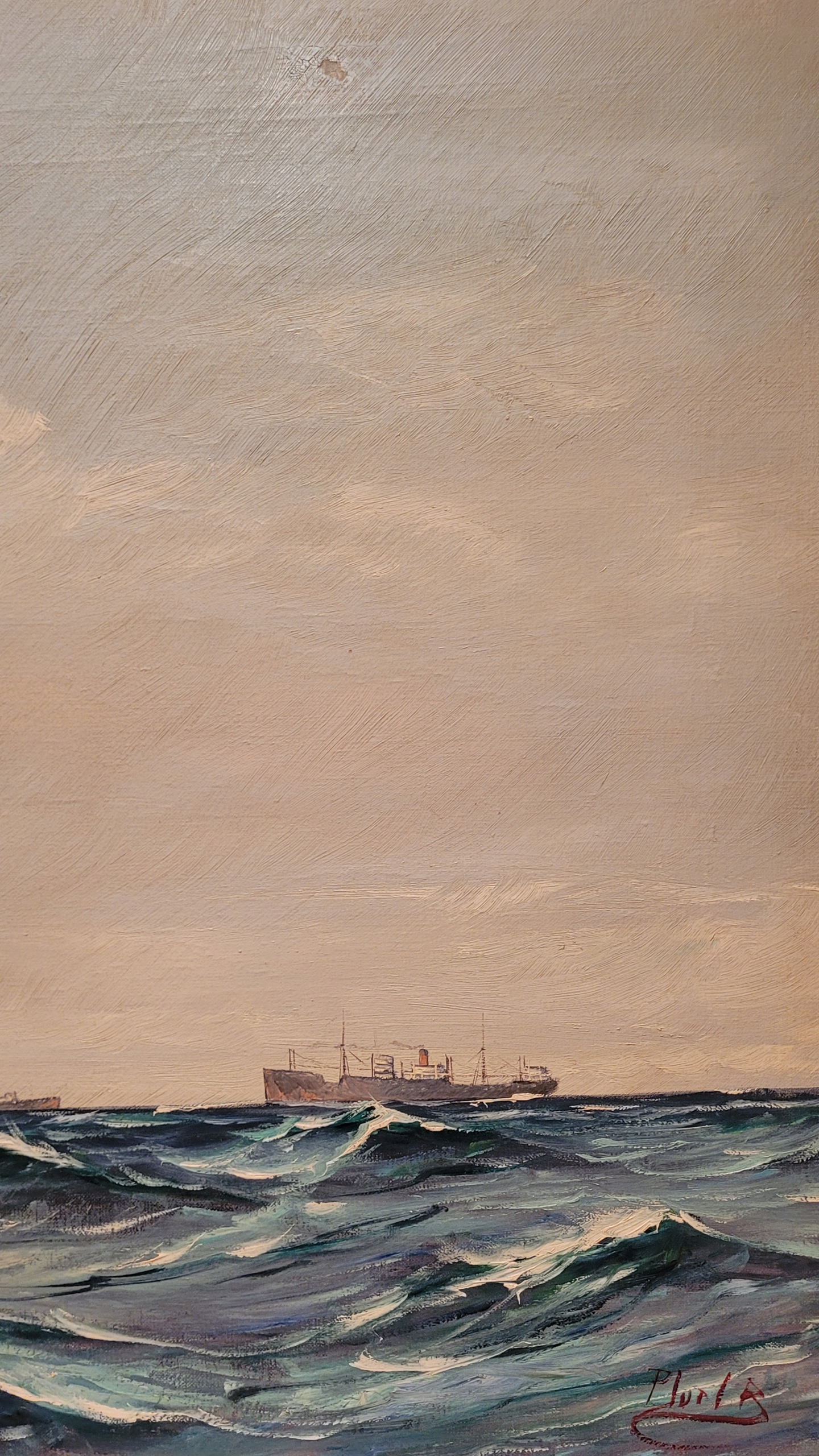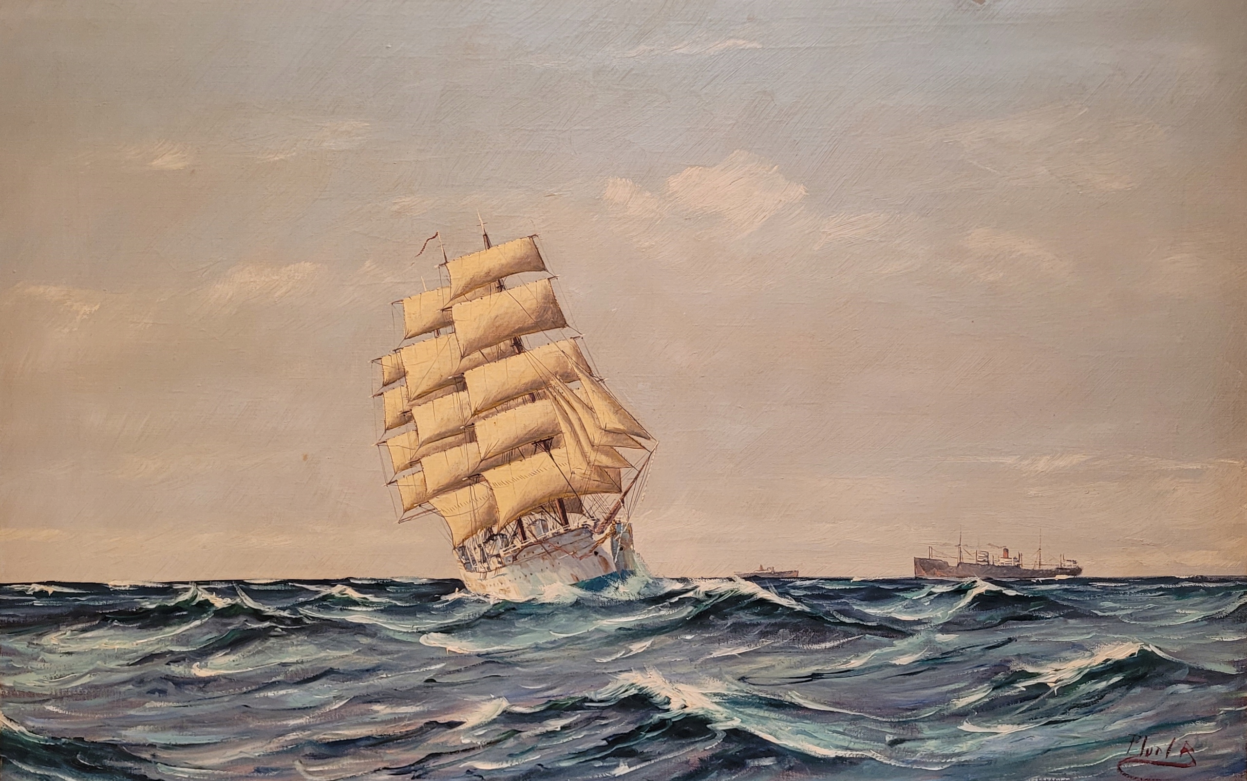 "ПАРУСНИК", старинная, подписанная картина маслом.
