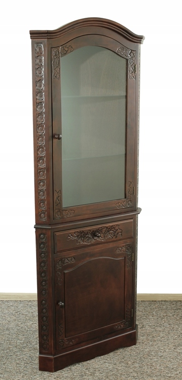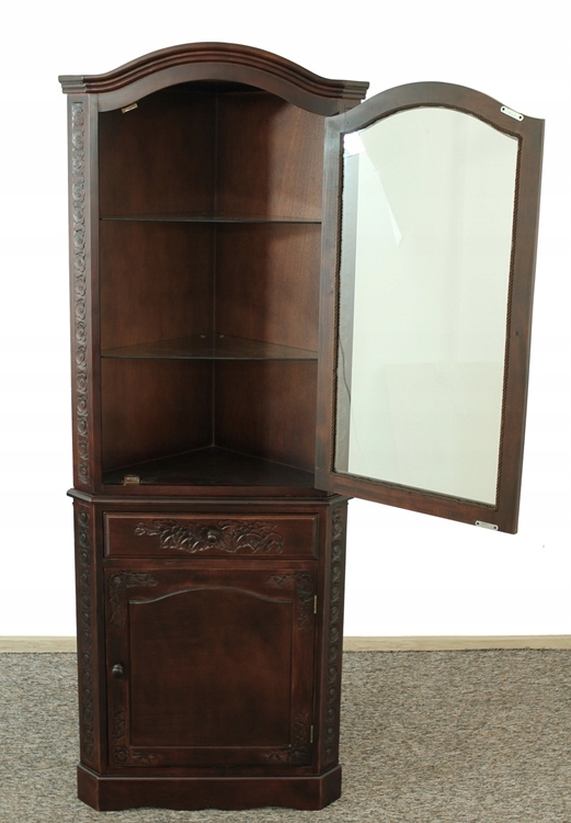 Очаровательный угловой предмет мебели со стеклянными полками, шкафчиком и ящиком. Вся вещь украшена красивой резьбой.