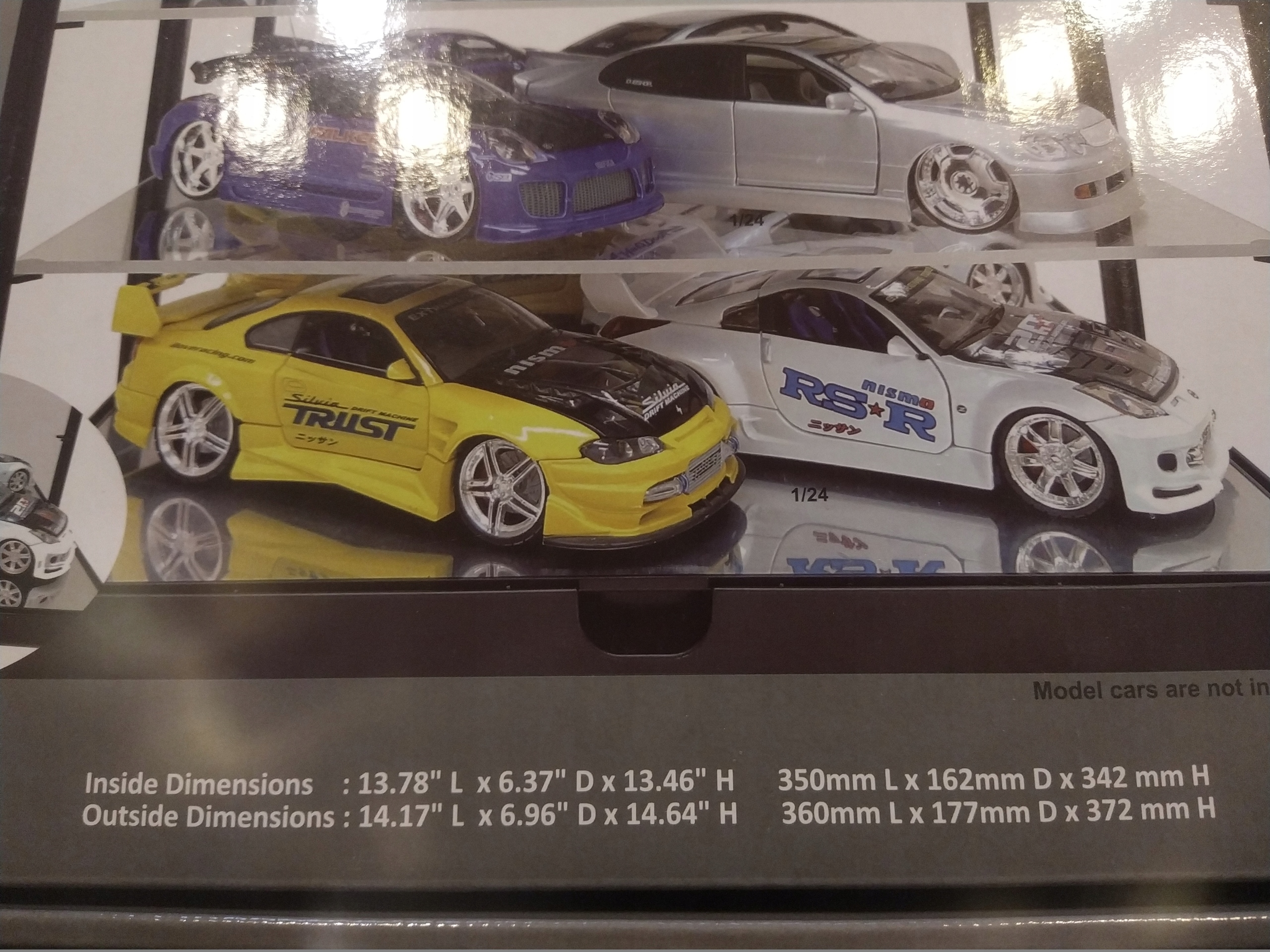 Витрина может вмещает 4 модели в масштабе 1:18, или 8 моделей в масштабе 1:24, или несколько моделей в масштабе 1:43 или меньше.