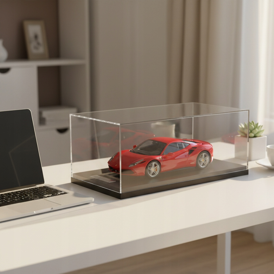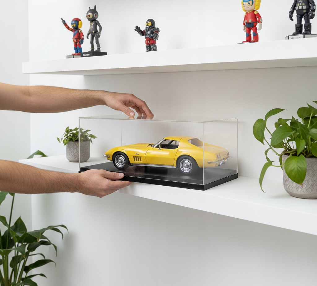 Кристально чистые стены позволяют любоваться каждой деталью вашей модели со всех сторон, а сплошное черное основание придает всему этому профессиональный музейный характер.