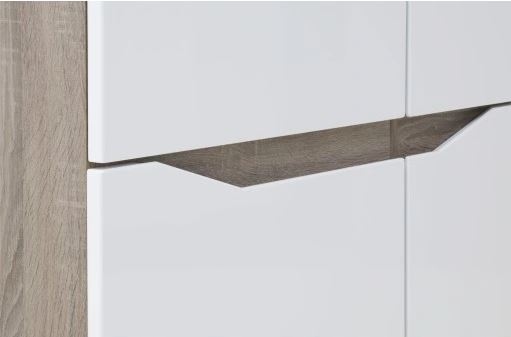 Витрина — идеальный предмет мебели, если у вас есть предметы или украшения, которые вы хотите показать особым образом. Витрина Lionel чрезвычайно стильна и элегантна, благодаря чему ваш интерьер приобретет современный характер. В мебели сочетаются два цвета: глянцевый белый и трюфельный дуб Сонома. Простую форму кузова нарушает асимметричный двухдверный фасад со стеклами в более широких дверях и фрезерованными ручками.
