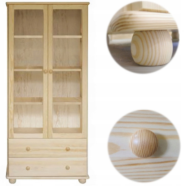Деревянная витрина полностью изготовлена из массива сосны. Из ДВП изготовлены только задняя стенка и днища ящиков. В верхних дверях вставлено стекло.