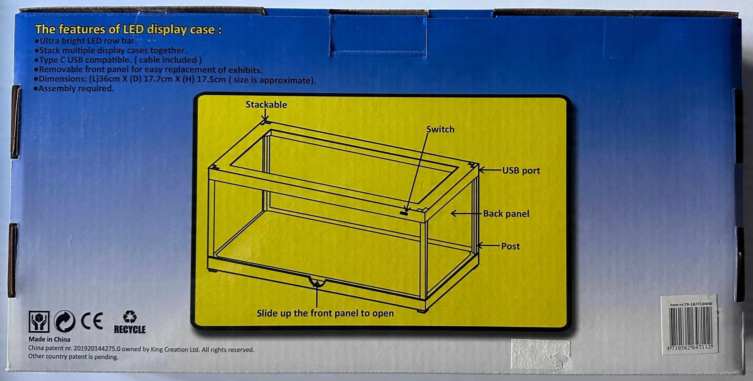 Внешние размеры витрины, включая подставку 36 см х 17,7 см х 17,5 см.