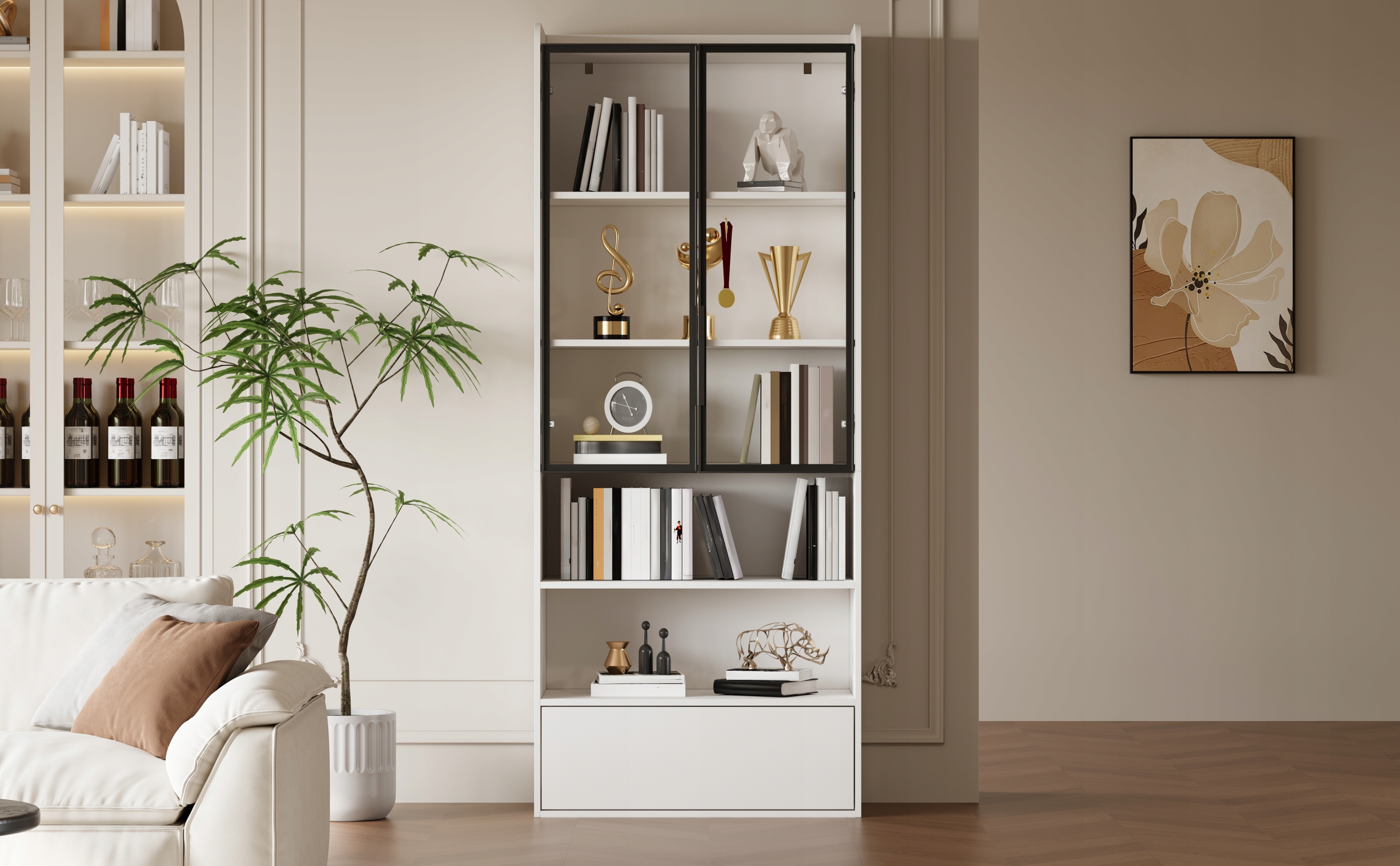 5. Универсальный и стильный аксессуар: благодаря черной глянцевой рамке и стеклу панели, этот шкаф служит одновременно витриной и местом для хранения вещей, идеально вписываясь в современный, скандинавский или минималистский декор.