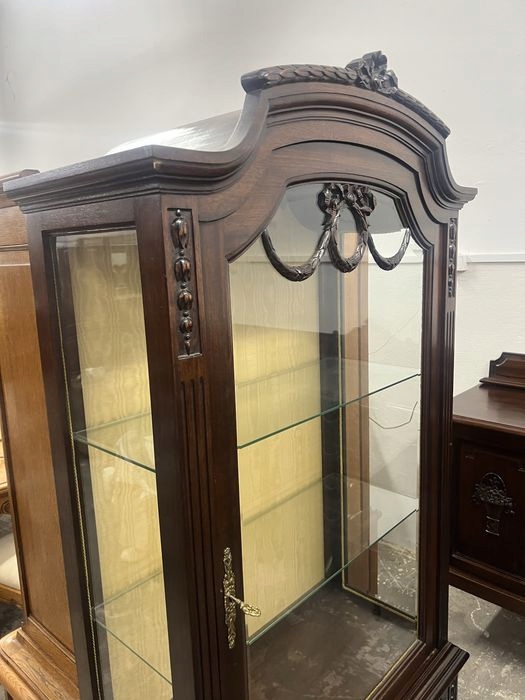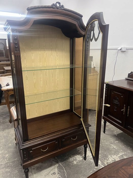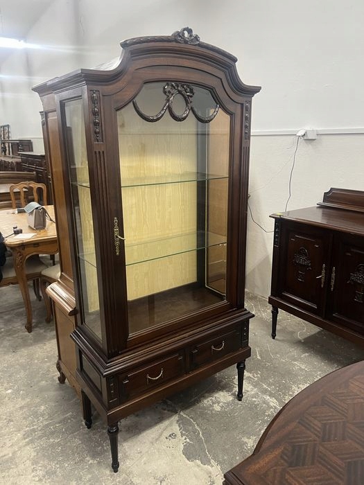Характеризуется: богато декорированным навершием с ленточным мотивом, стеклянным фасадом со стеклянной полкой, двумя практичными ящиками в нижней части, тонкими точеными ножками, элегантным цветом темного дерева.