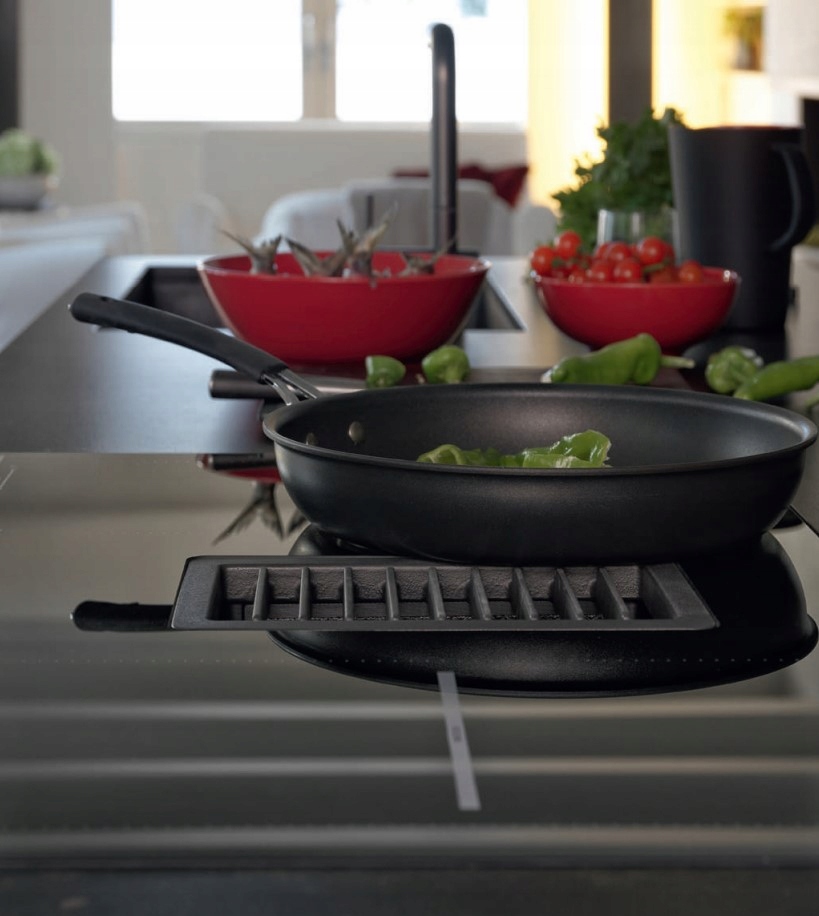 Входное отверстие находится на одном уровне с поверхностью варочной панели, что позволяет перемещать посуду, не поднимая ее.