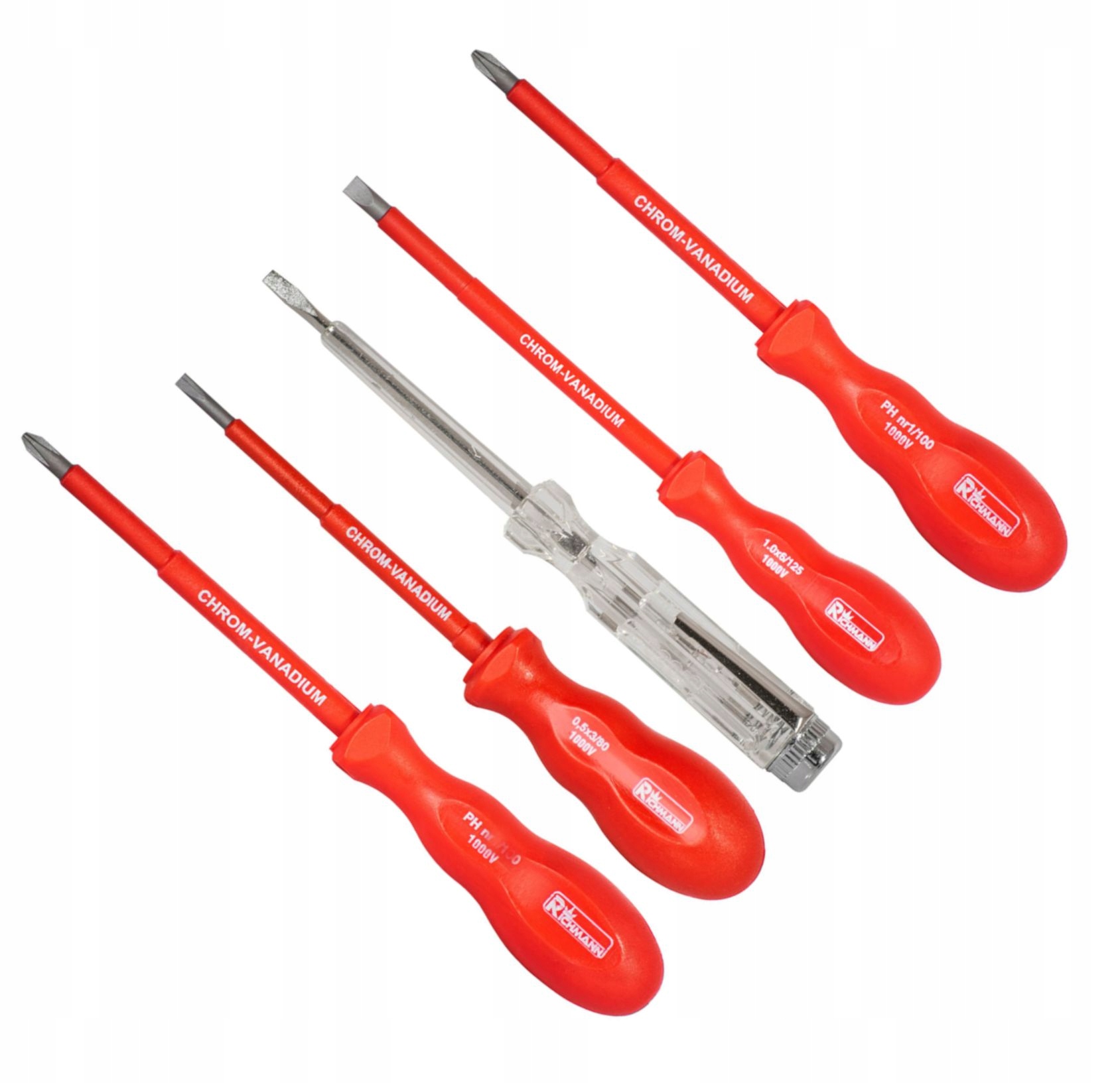 В комплект входят 5 изолированных красных отверток + 1 тестер. Изоляция до 1000 В. Рабочая часть из хромованадиевой стали (CR-V). Эргономичная ручка обеспечивает комфорт во время работы. Польский продукт. Высокое качество изготовления. Эстетичный внешний вид.