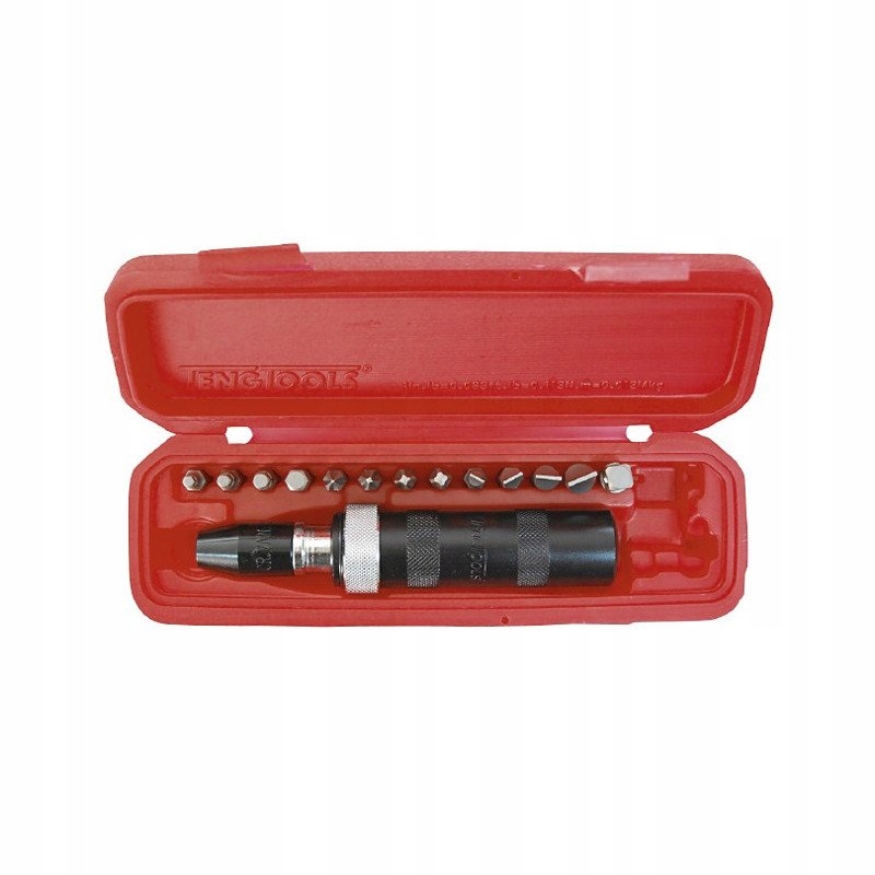 Набор состоит из 15 элементов. С настройкой вращения вправо-влево. Базовый хвостовик отвертки имеет квадратный размер 1/2 дюйма, но он также оснащен ручкой, позволяющей вставлять наконечники с шестигранным хвостовиком 5/16 дюйма. В комплект входит переходник 5/16–3/8, держатель для бит 1/2–5/16 дюйма и 12 различных насадок для отверток. Поставляется в пластиковой коробке.