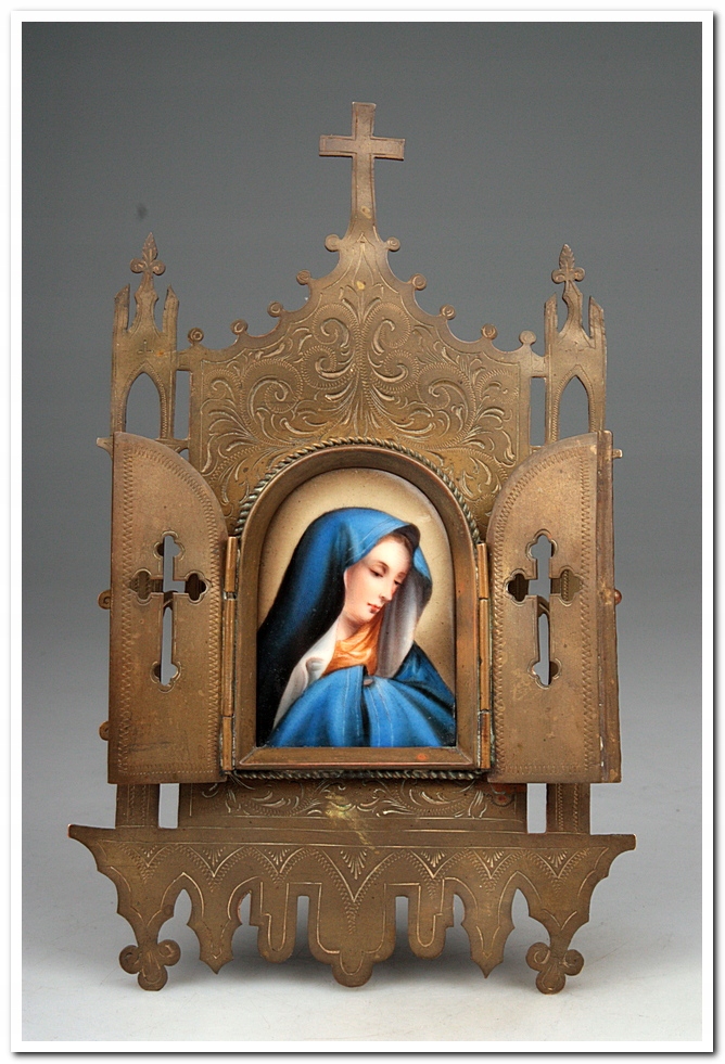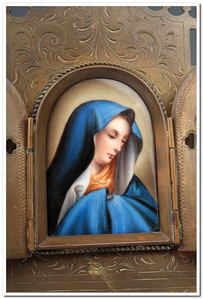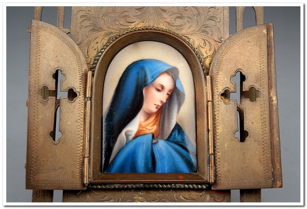 Картина, написанная вручную на фарфоре «Молящаяся Богородица» - миниатюра. Латунный переплет. Германия, вторая половина 19 века. Состояние очень хорошее.