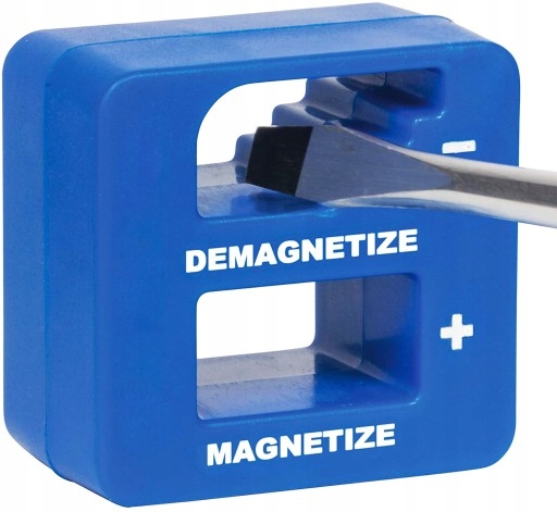Устройство, предназначенное для намагничивания и размагничивания отверток, винтов, пинцетов и других предметов из сплавов железа. Он отлично работает везде, где необходимо использовать магнетизм, например, выдергивая незакрепленный винт или гайку из тугого места, например, в автомобиле, используя только отвертку или наконечник; или его отсутствие, например, при работе с прецизионной электроникой, где невозможно передать нагрузку. Сильный магнит, встроенный в куб, также поможет очистить рабочее место от металлических опилок.