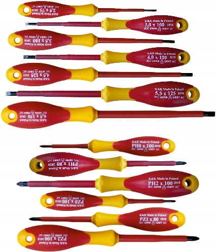 Индивидуальное тестирование погружением. Все отвертки проходят испытание на прокол в соответствии со стандартом IEC 60900. Десять раз более высокая измерительная нагрузка в 10 000 В гарантирует безопасную работу при максимально допустимом напряжении 1000 В. Производимые нами отвертки выдерживают напряжение 20 000 В при испытаниях на пробой. Формы и размеры отверток соответствуют требованиям следующих стандартов: PN-ISO 2380-1:2001, PN-ISO 8764-1:2003, PN-ISO 8764-2:2003, IEC 60900 (PN-EN-60900). ).