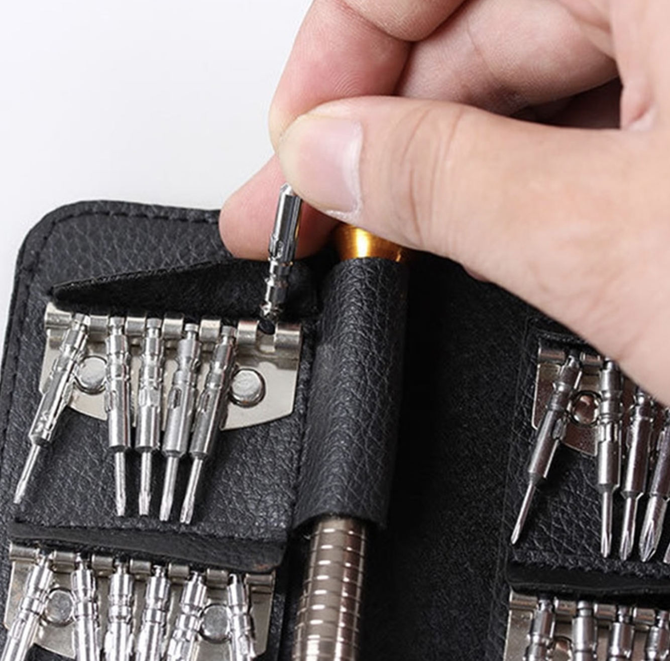 - В комплект входят 24 прецизионные насадки и удобная профилированная ручка. Отвертки упакованы в элегантный и удобный чехол, похожий на кошелек.