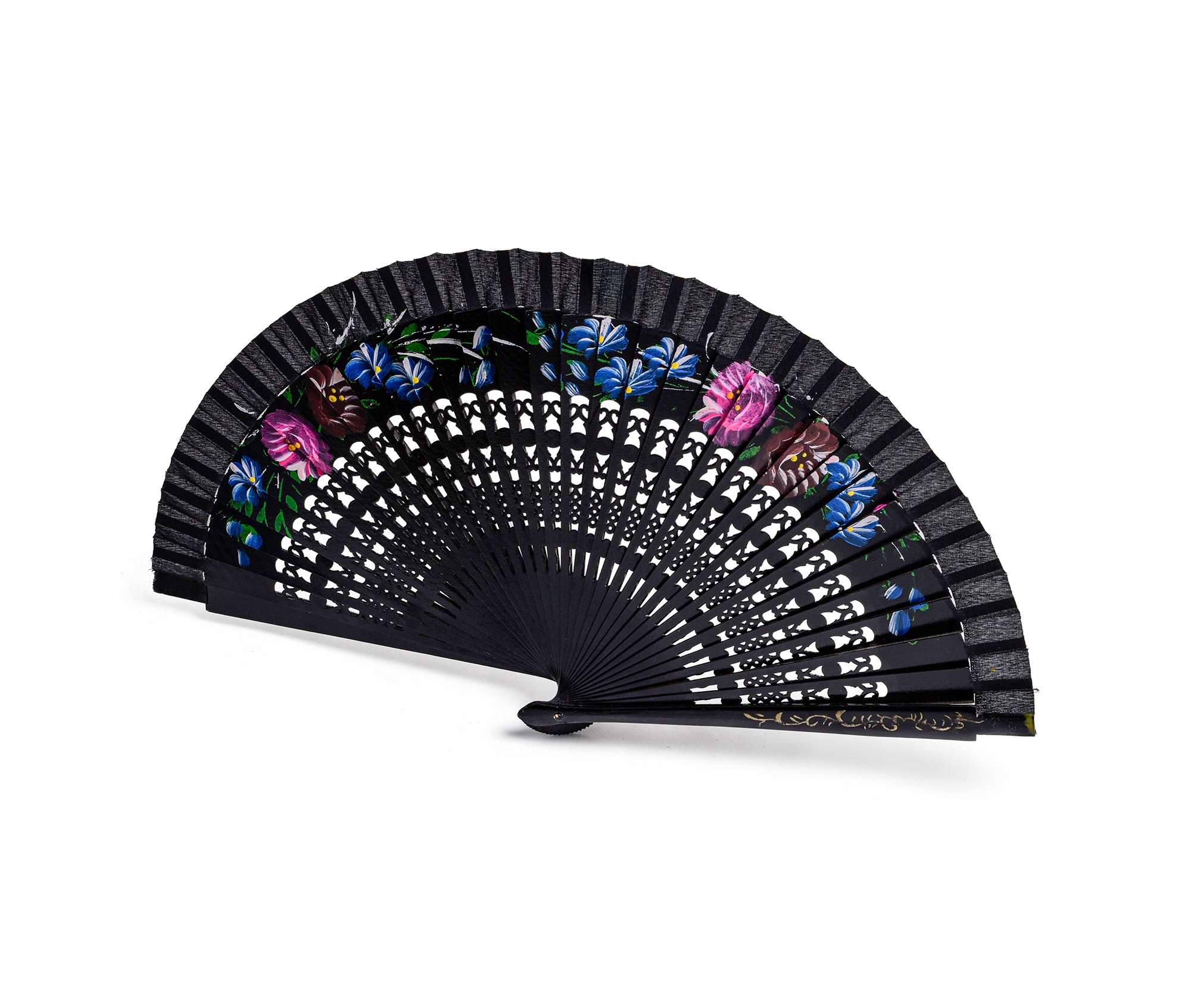 Элегантный декоративный вентилятор - черный, лакированный, сложенный h1> - Стильный ассортимент среднего, изготовленного из лакированного дерева с красивыми, окрашенными цветочными украшениями. Идеально как практическое гаджет в жаркие дни, а также уникальное украшение для фотосессий, танцев или как часть вечернего наряда.