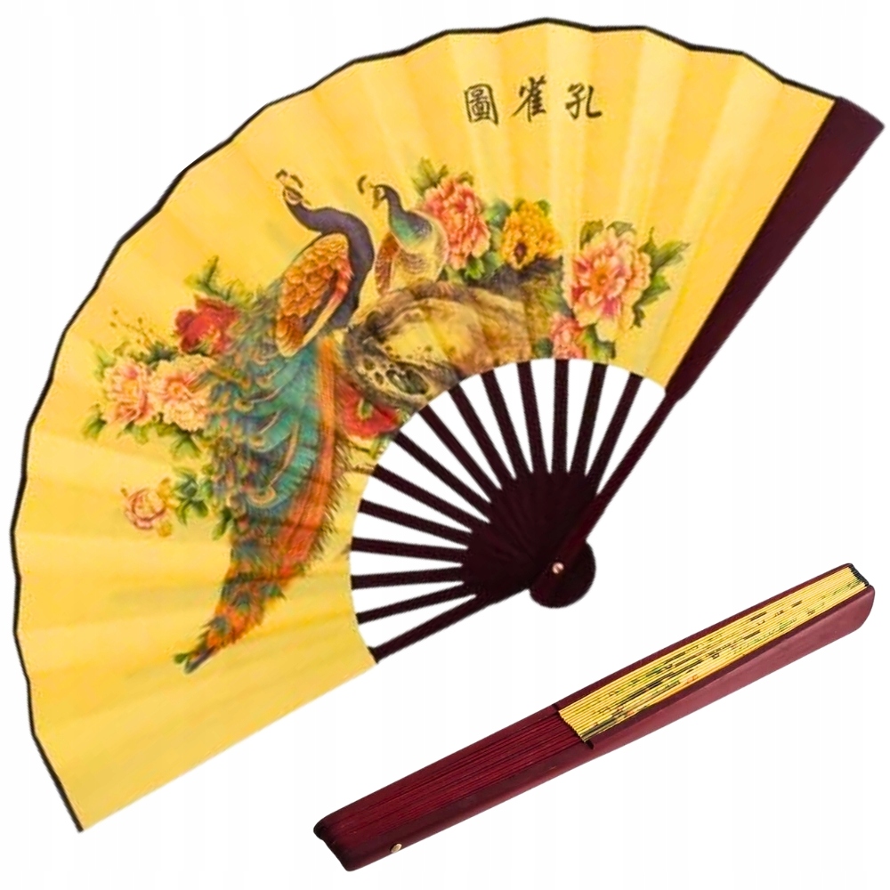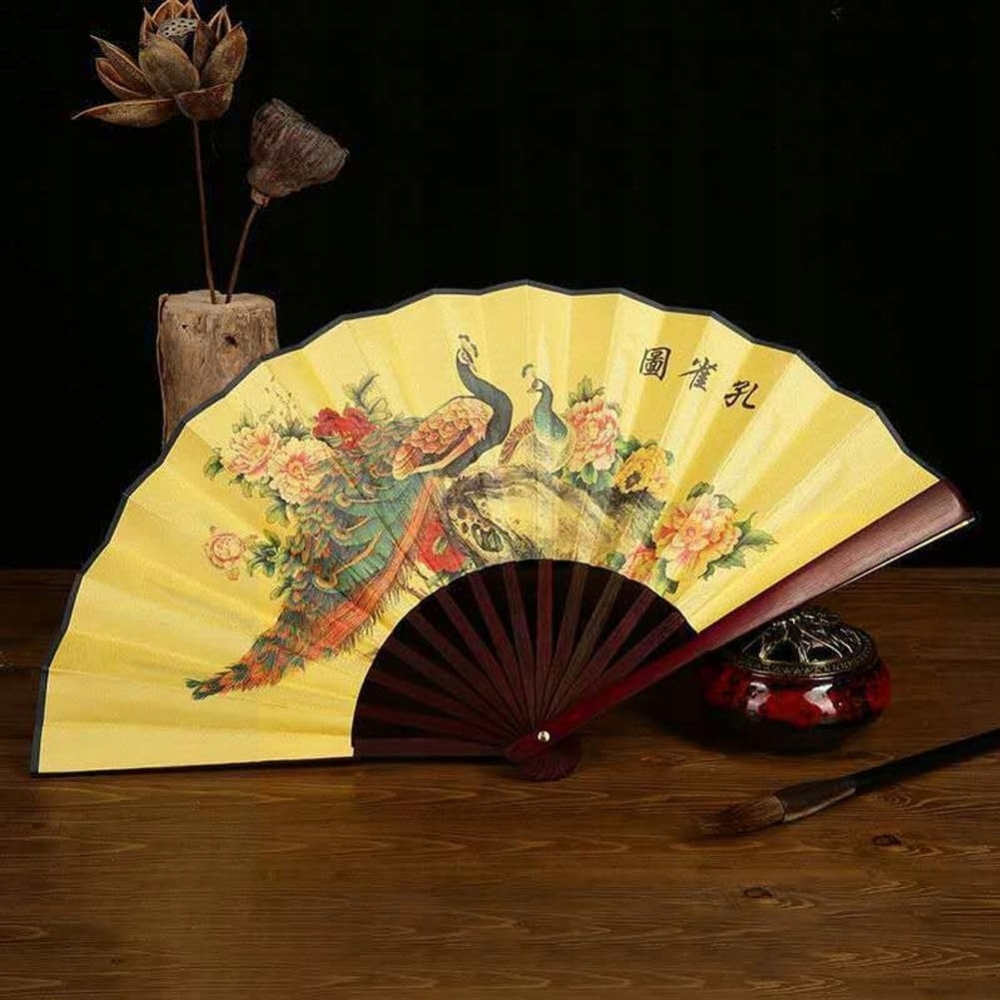 Элегантный складной веер в китайском стиле с прочной бамбуковой ручкой. В китайской культуре павлины символизируют красоту, достоинство и счастье. Они часто ассоциируются с достоинством и гармонией, а их разноцветные перья считаются признаком богатства и защиты от злых духов. Павлины появляются в искусстве и украшениях как символы удачи и долгой жизни.