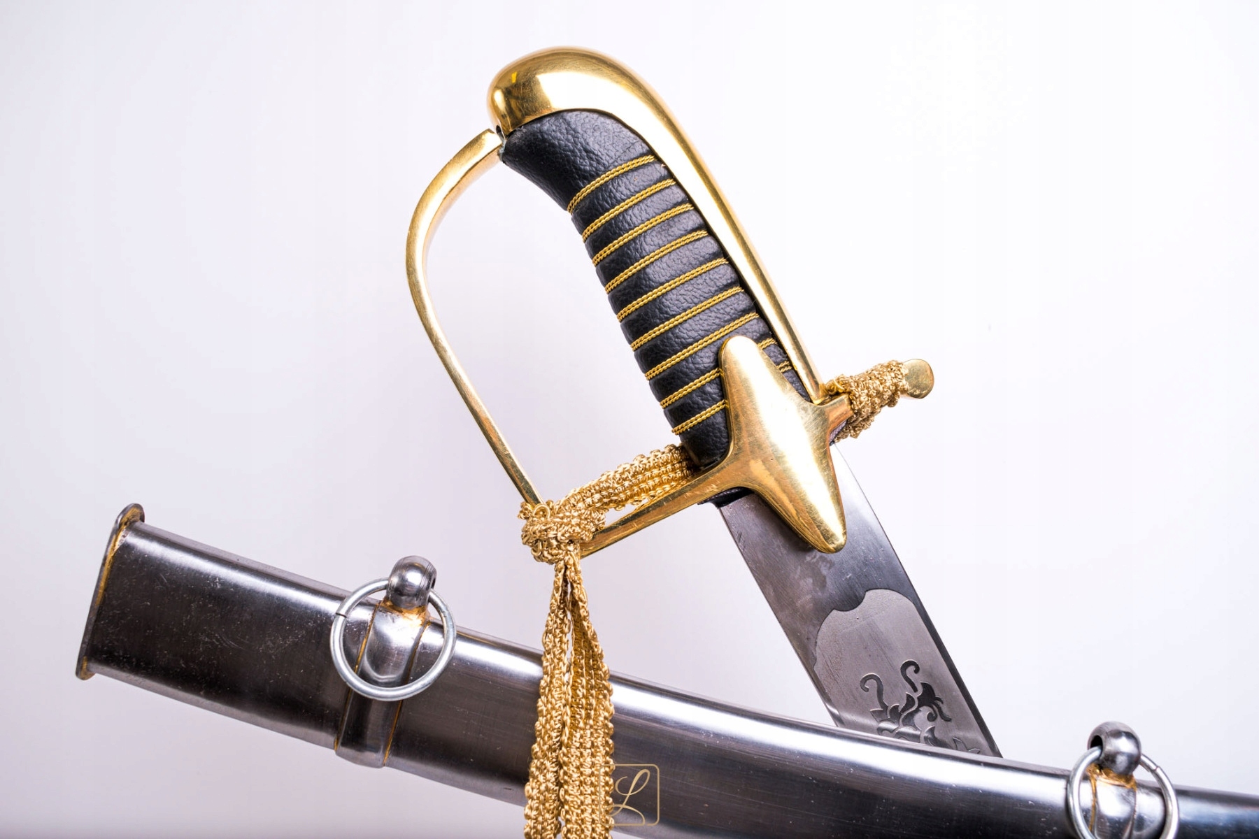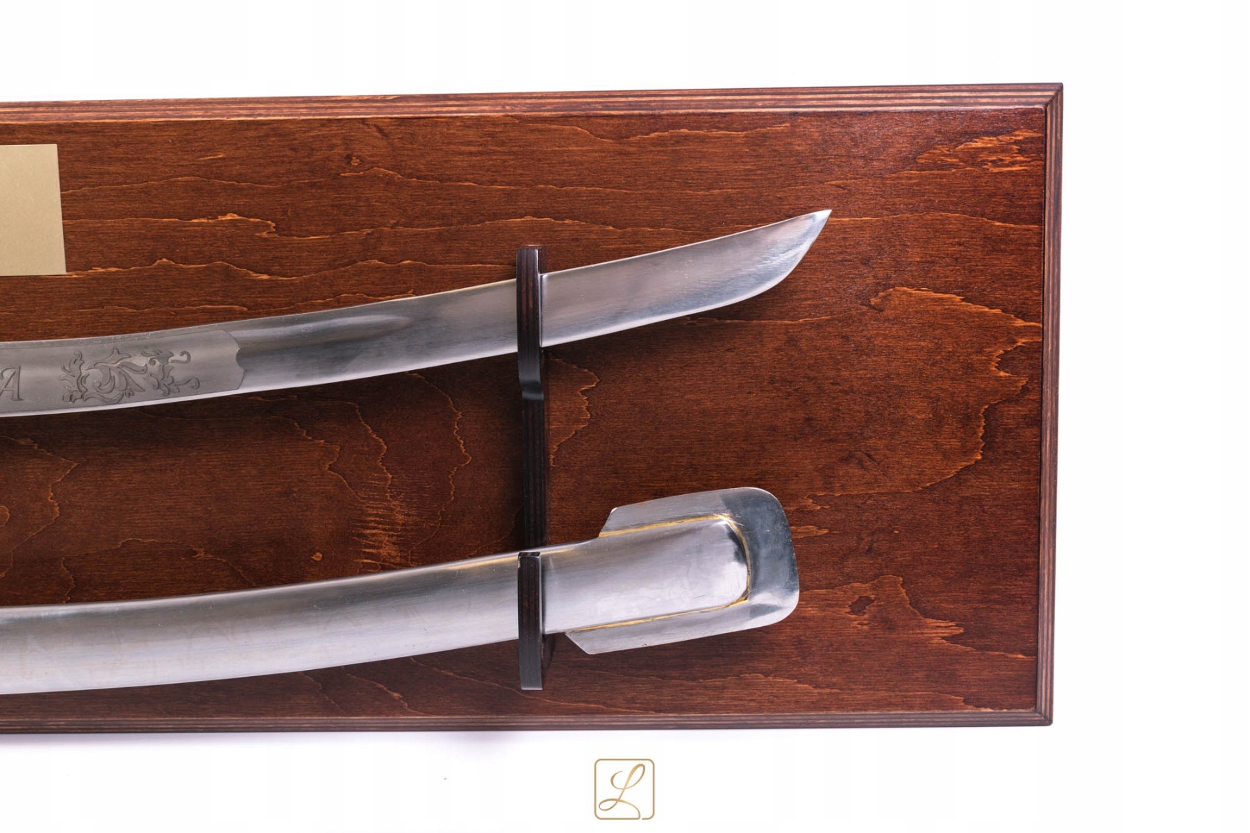 Рукоять изготовлена из дерева, обтянута черной кожей. Видны насечки, заполненные скрученной латунной проволокой, так называемые абордажная сабля. Латунная перемычка арбалета с усами. Лезвие изготовлено из высококачественной, незакаленной стали, с полуглянцевым покрытием. На внешней амфибии красивый, БОЛЬШОЙ гравюр: «ЧЕСТЬ И РОДИНА». К ручке привязана декоративная перевязь из ткани, золотая лента, отделанная красной кисточкой - пучком ниток. Ножны из листового металла, с двумя пазами и подвижными кольцами, заканчивающимися шпорой. Красиво сделанная сабля, которая эффектно смотрится на прилагаемом столе. Стол из фанеры, мориленной и покрытой матовым лаком. Сзади стола есть два крючка, которые можно повесить на стену. Работа польского мастера для презентации холодного оружия.