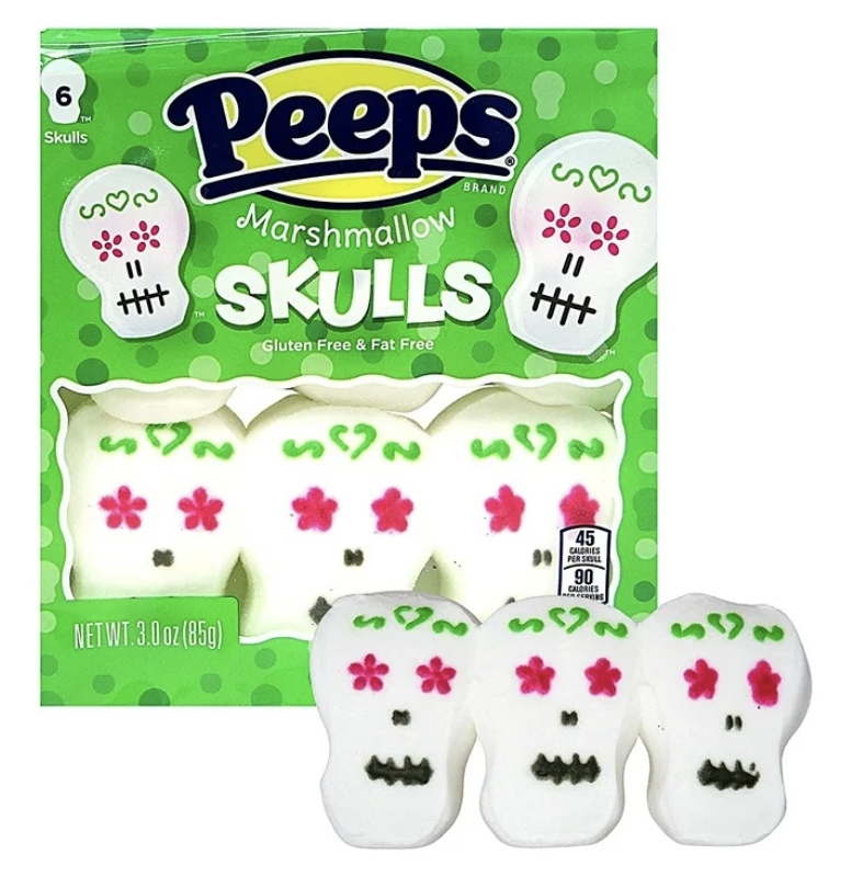 Зефир «Colorful Peeps» в форме черепов — сладкое предложение, вдохновленное мексиканским праздником Día de los Muertos. Нежные, воздушные и слегка ванильные на вкус, они украшены сахарными узорами, напоминающими декоративные черепа. Их можно использовать в качестве закуски, подарка или украшения десертов и тортов. Продукт без глютена и жира – идеален для любителей необычных сладостей.
