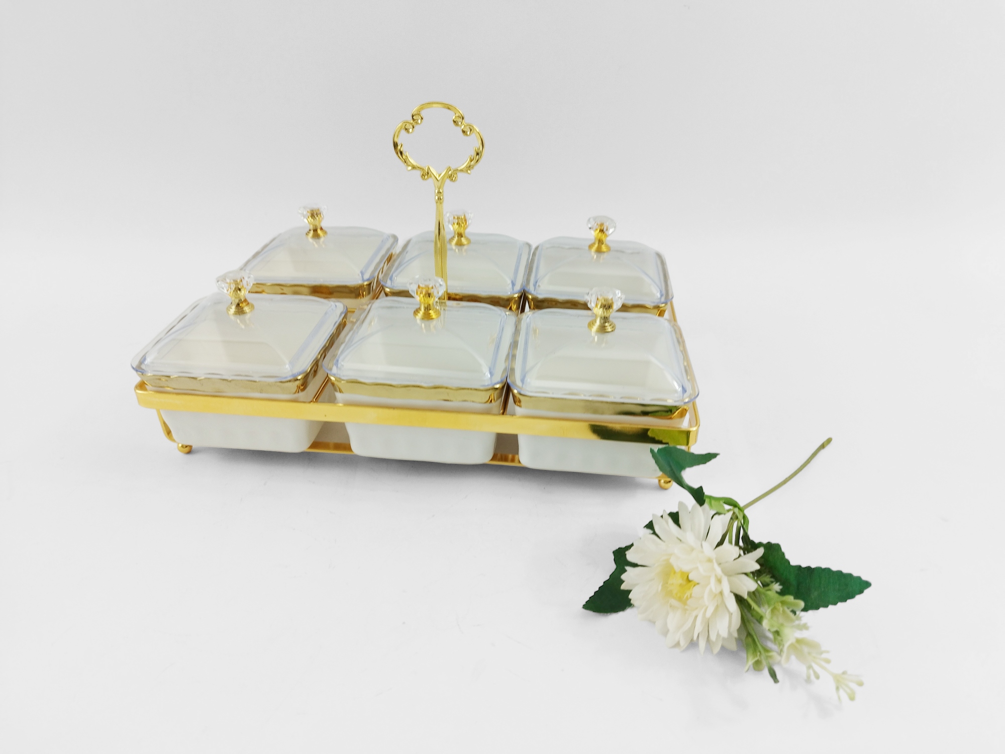 Сервиз для закусок состоит из стеклянных пиал, разделенных на 6 частей и все на металлической подставке