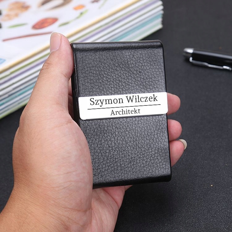 Предлагаем Вам уникальную визитку, сочетающую в себе шик и элегантность. Наша визитница изготовлена из высококачественной экологической кожи. Стальные элементы отполированы до блеска, что подчеркивает роскошный характер изделия, а его несомненным преимуществом является возможность нанесения на поверхность тонкой и персонализированной гравировки по вашему выбору.