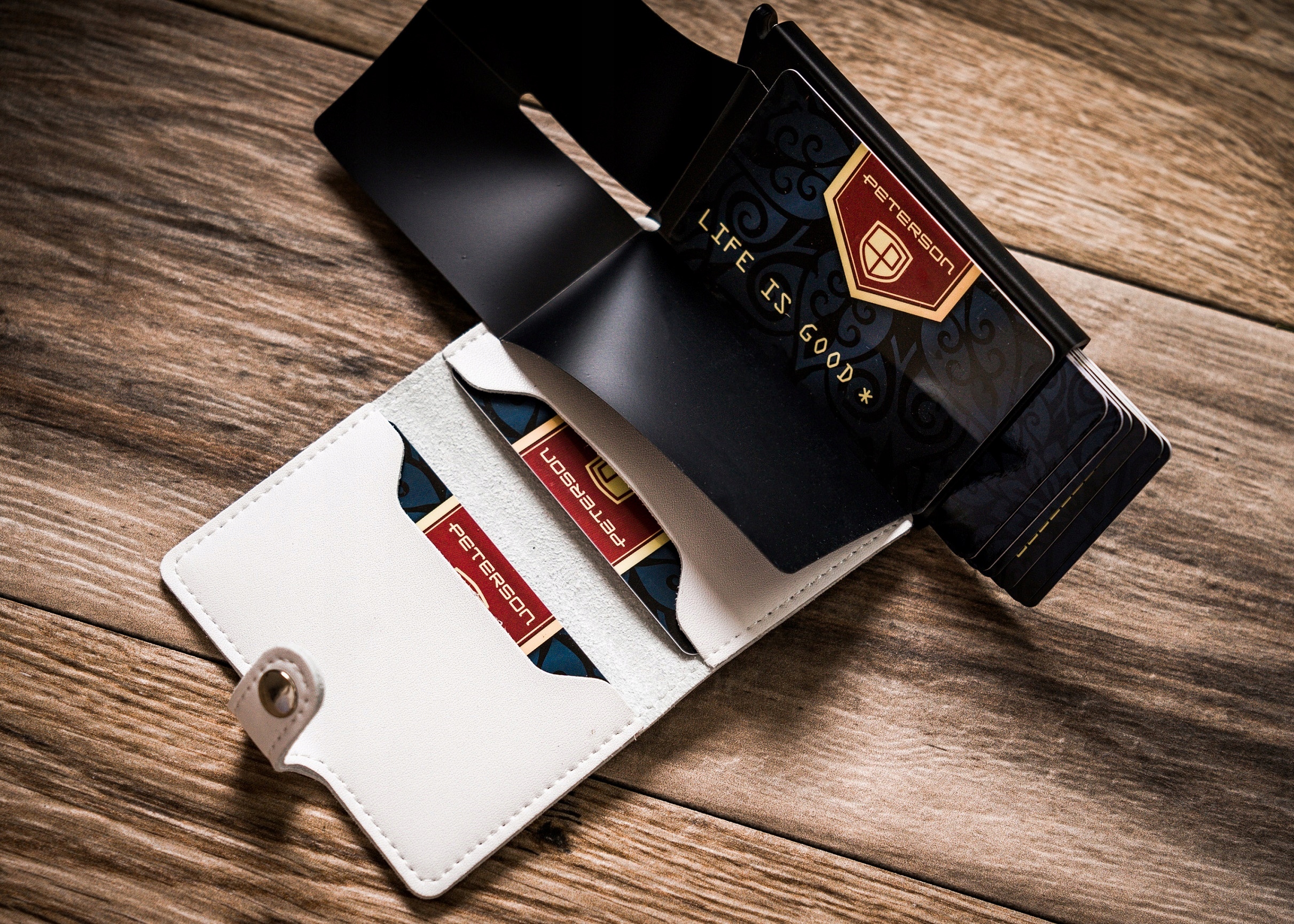 Кошелек оснащен защитным футляром для карт с интеллектуальной системой легкого извлечения карт — просто потяните небольшой рычаг, и карты сразу же выскользнут. Изготовлены из алюминия, защищают карты от изгиба, поломки и нежелательных бесконтактных транзакций.