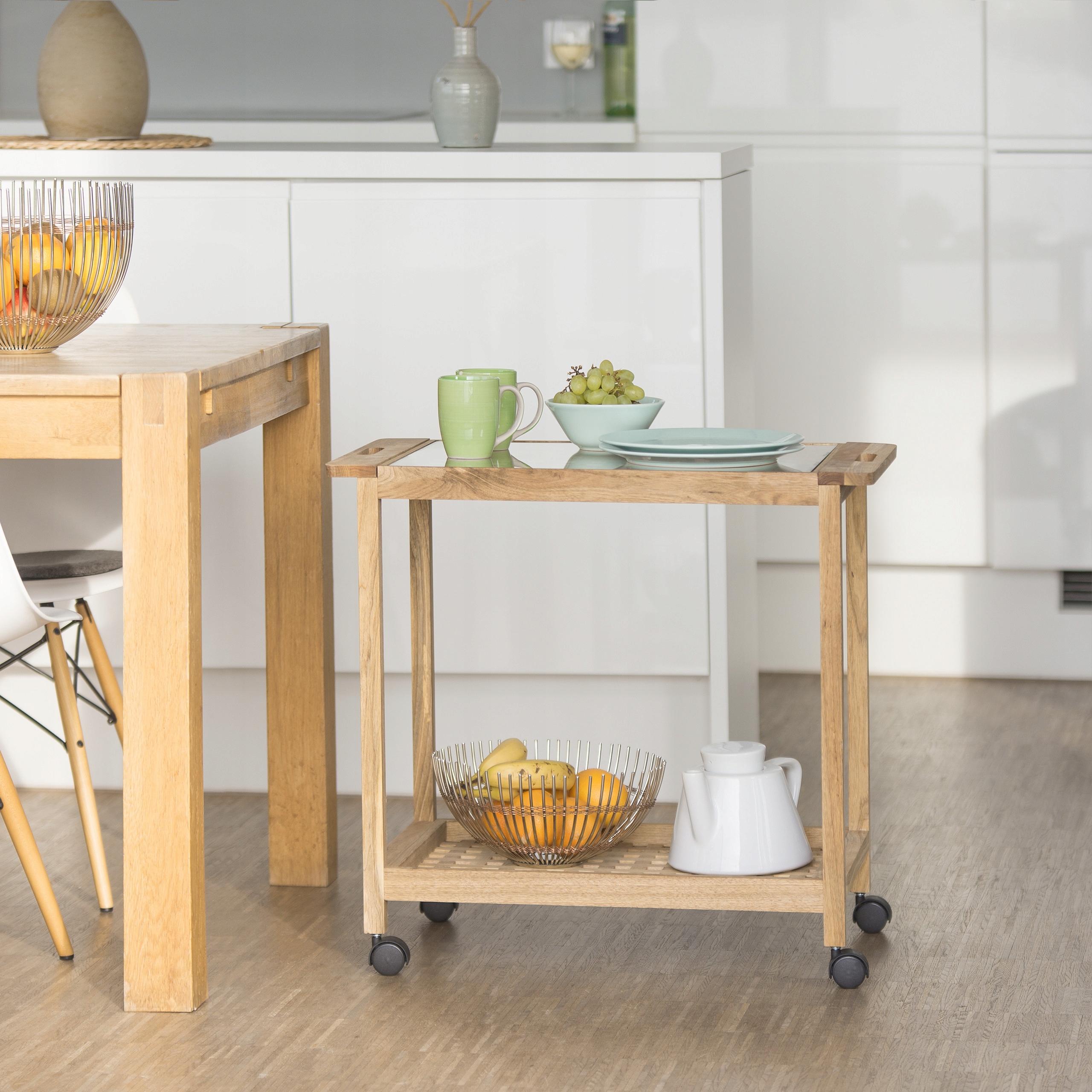 Используйте поверхность этой кухонной тележки как интересный способ хранения вещей, которые раньше валялись по углам кухни и столовой. Этот мобильный бар изготовлен из орехового дерева и может использоваться как со стеклянной столешницей, так и без нее. 4 бесшумных колеса коляски вращаются на 360 градусов. Таким образом, вы можете взять свой бар куда захотите! 2 удобные ручки по бокам мобильной полки позволят переносить ее через порог двери. Благодаря открытым полкам этого современного шкафа все продукты всегда под рукой. Кухонная тележка также отлично подойдет в качестве полки для чистящих средств в ванной или подставки для цветов в зимнем саду.