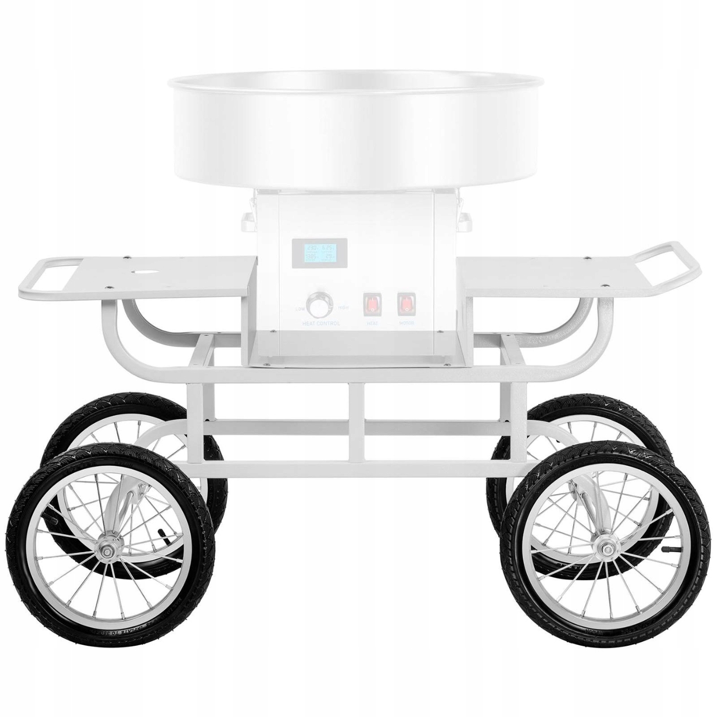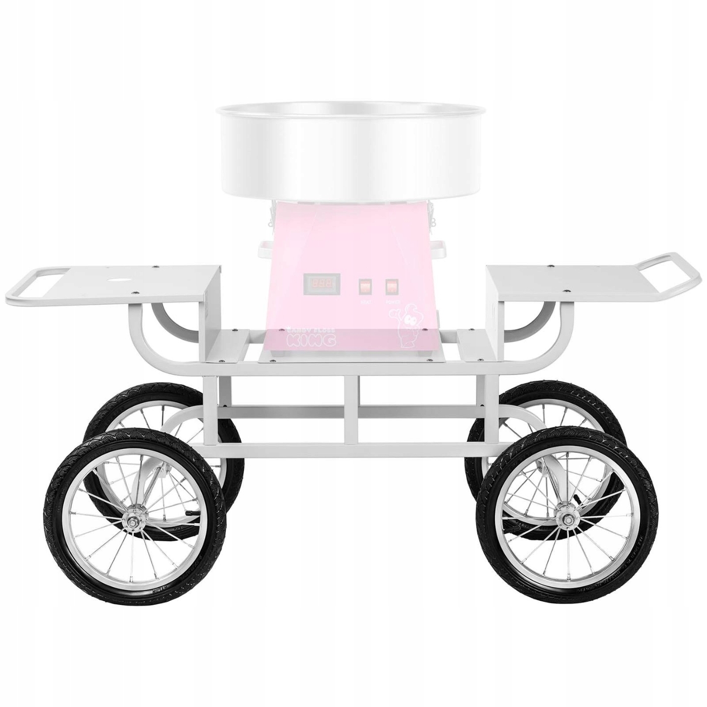 Привлекательный дизайн – отличительная особенность тележки для аппарата по производству сладкой ваты. Интересный дизайн в стиле ретро идеально сочетается с функциональностью. На двух полках удобно разместить вспомогательные аксессуары. Прочная стальная рама опирается на оси с резиновыми колесами. Они достаточно большие, чтобы покрыть даже очень неровные поверхности. Таким образом, машина хорошо защищена от возможных ударов. Ручки облегчают транспортировку, а два удачно расположенных отверстия позволяют спрятать кабели. Также в коляске имеется отверстие (диаметр 4,7 см) для установки зонтика, который обеспечит тень и приятную атмосферу.