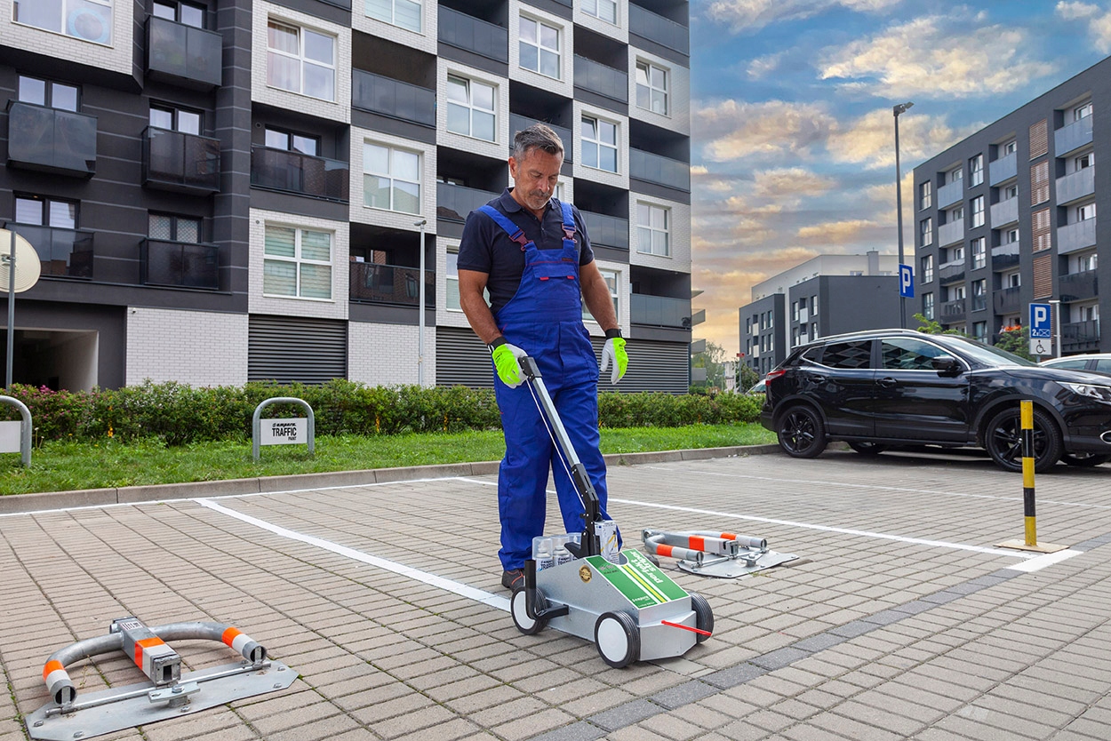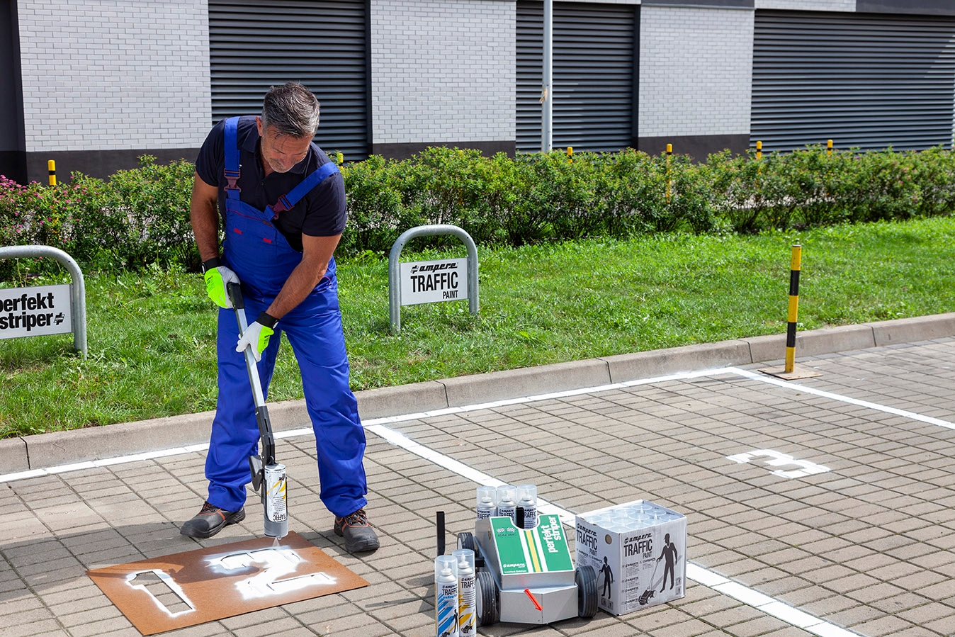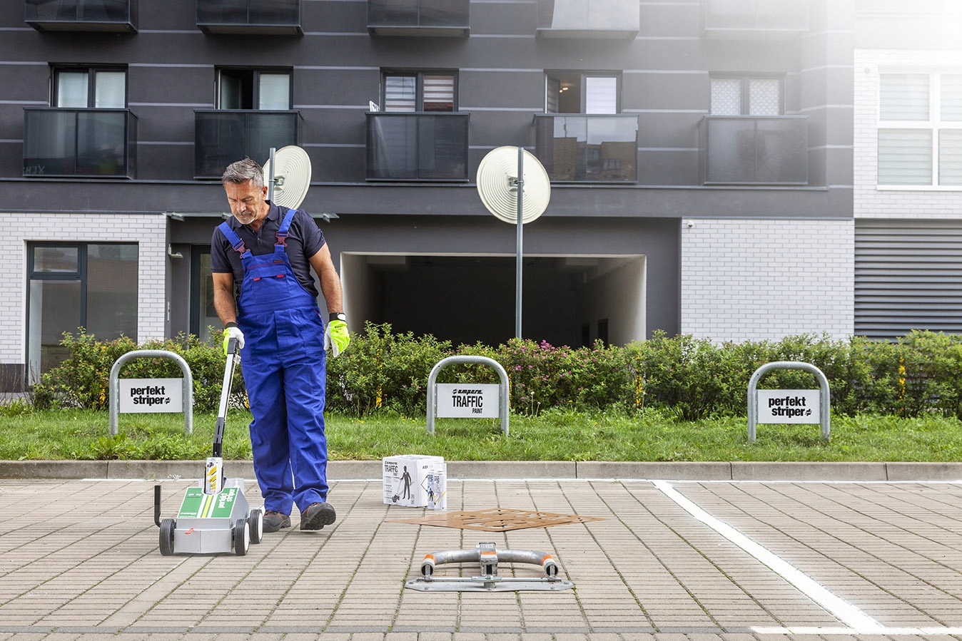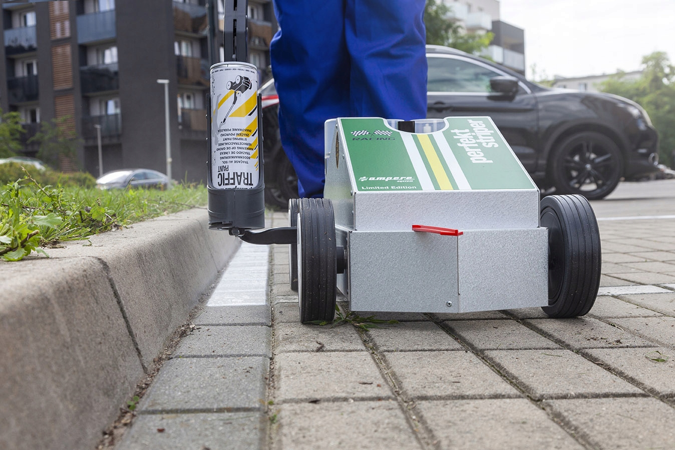 Разметочное устройство имеет функциональную ручку с кнопкой. С его помощью можно делать линии шириной от 5 до 10 см. Банка автоматически принимает правильное положение и регулируется в держателе. Тележка имеет широкие колеса, что делает разметку линий более стабильной и точной. Устройство имеет боковую подставку, которая позволяет производить маркировку вдоль стен, поддонов или машин. Кроме того, в коляске имеется полка, на которой можно разместить три распылителя.