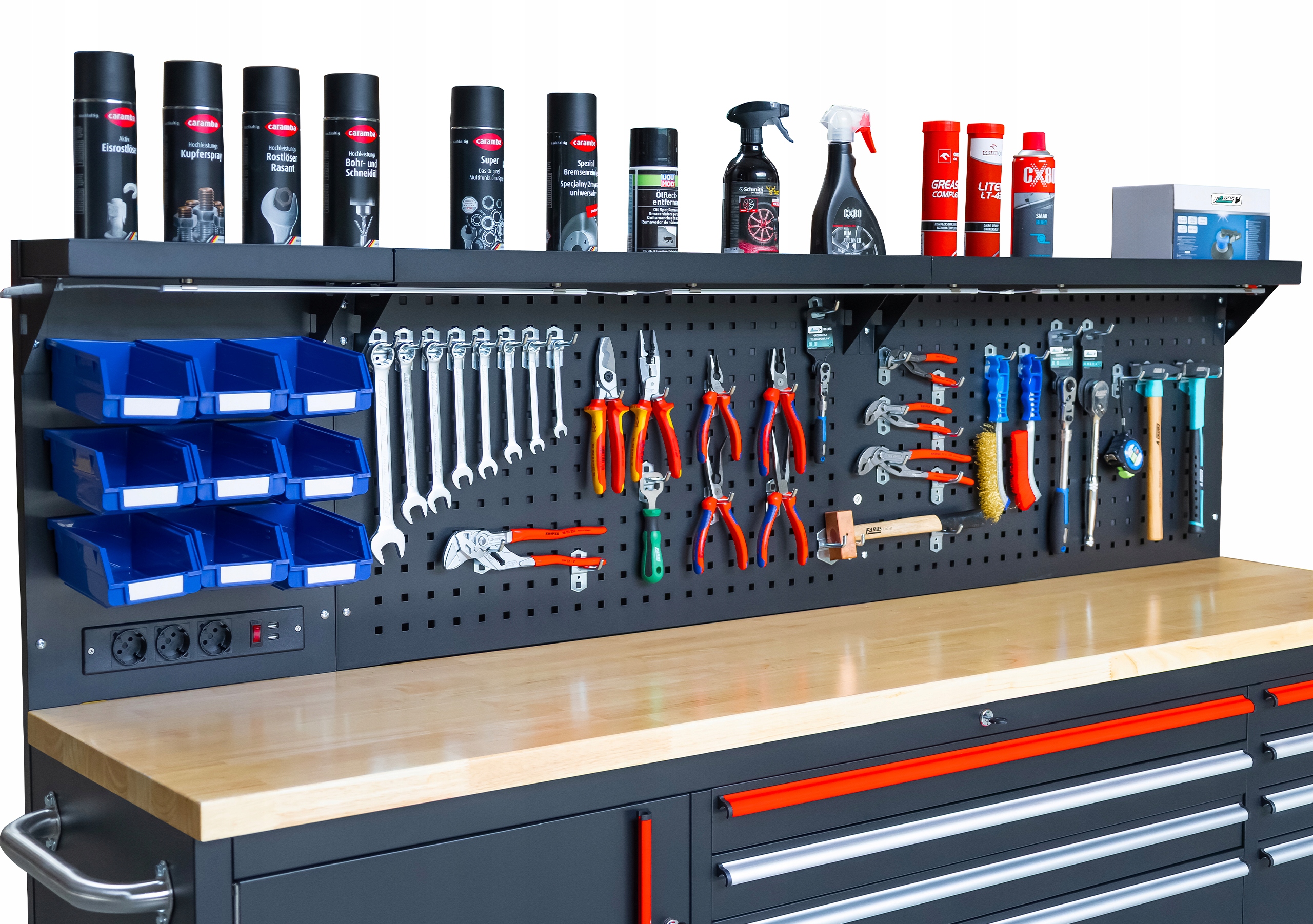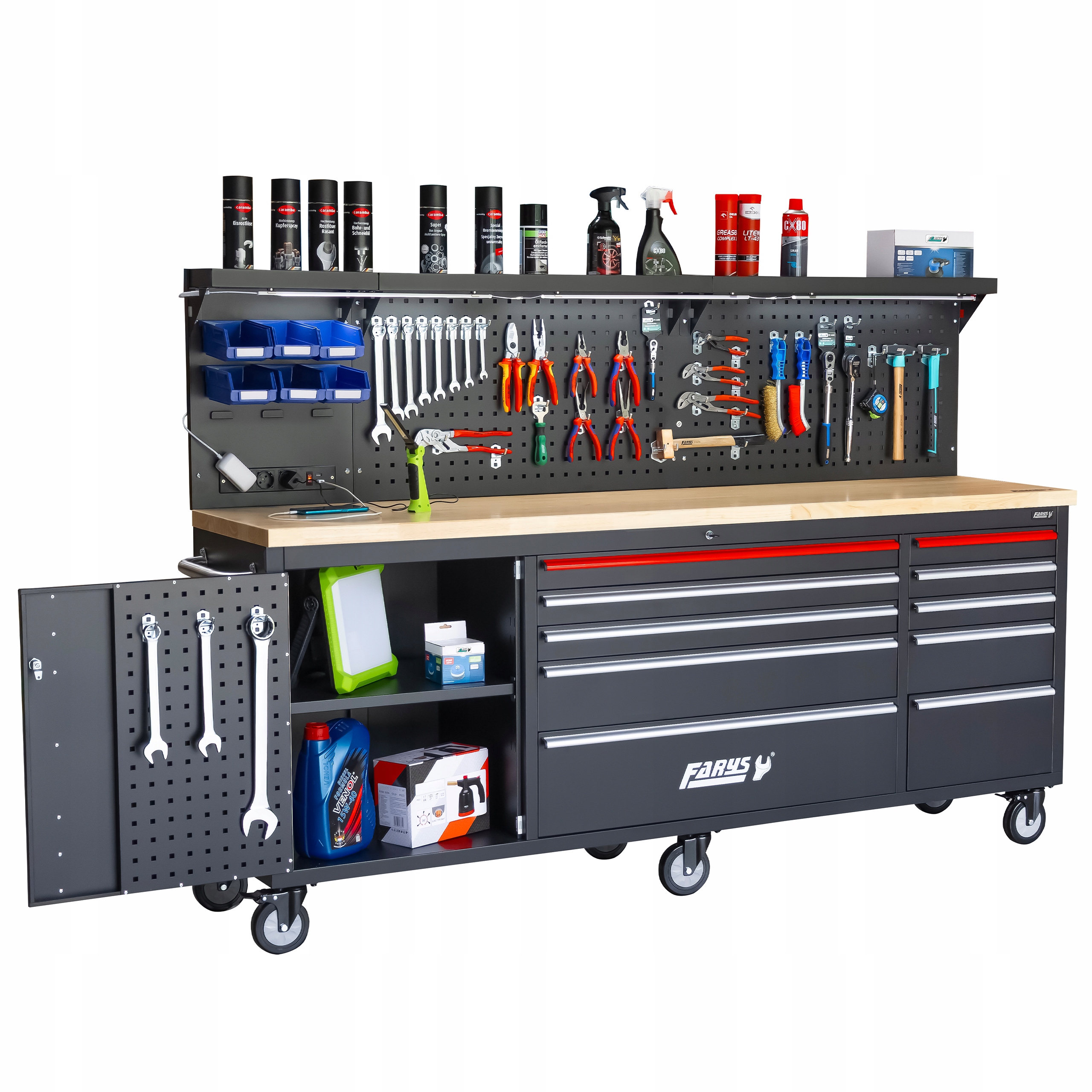 Шкаф имеет 10 практичных ящиков для инструментов, запирающихся на ключ, и шкаф с полкой внутри, позволяющей хранить более крупные предметы элементы.