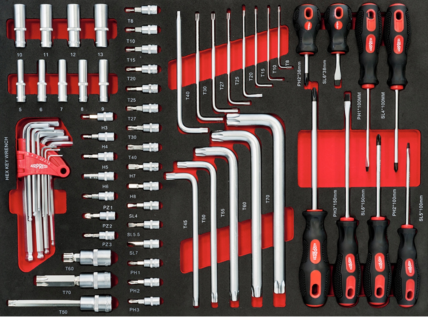 - свечные головки 16 и 21 мм- комплект внутренних головок Torx: Е10, Е11, Е12, Е14, Е16, Е18, Е20