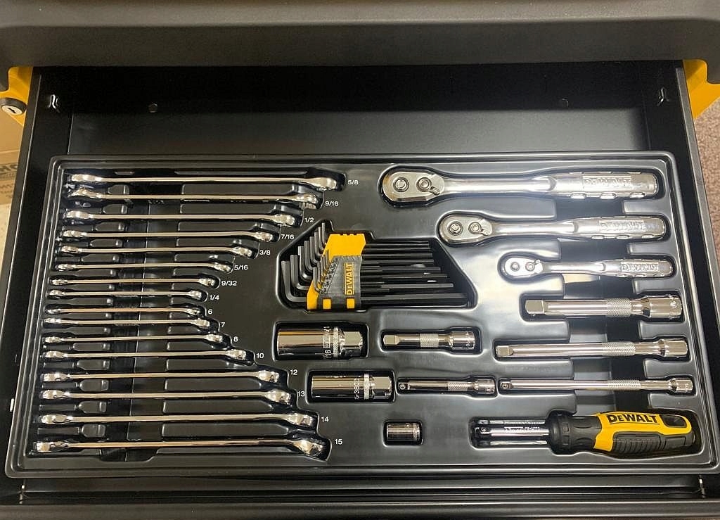 Пять закрытых ящиков вмещают 341 деталь, включая наборы торцевых ключей 1/4", 3/8", 1/2 дюйма и других инструментов. Другими словами, все, что вам нужно для DIY в вашей мастерской или гараже!