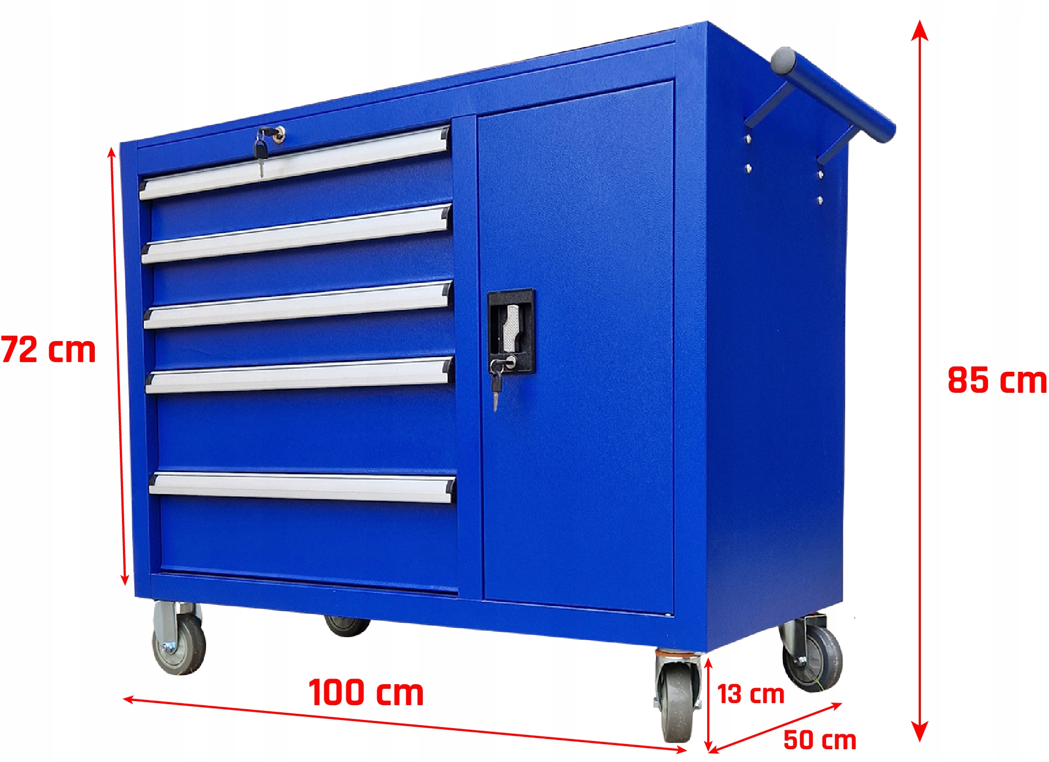 - Шкаф позволяет поддерживать порядок на работе и защищает инструменты от кражи (замок тележки). Тележка имеет эргономичную ручку, встроенную в верхнюю часть, а ящики на шарикоподшипниках полностью выдвигаются. Шкаф оборудован 2 комплектами ключей для центрального замка и бокового шкафа.