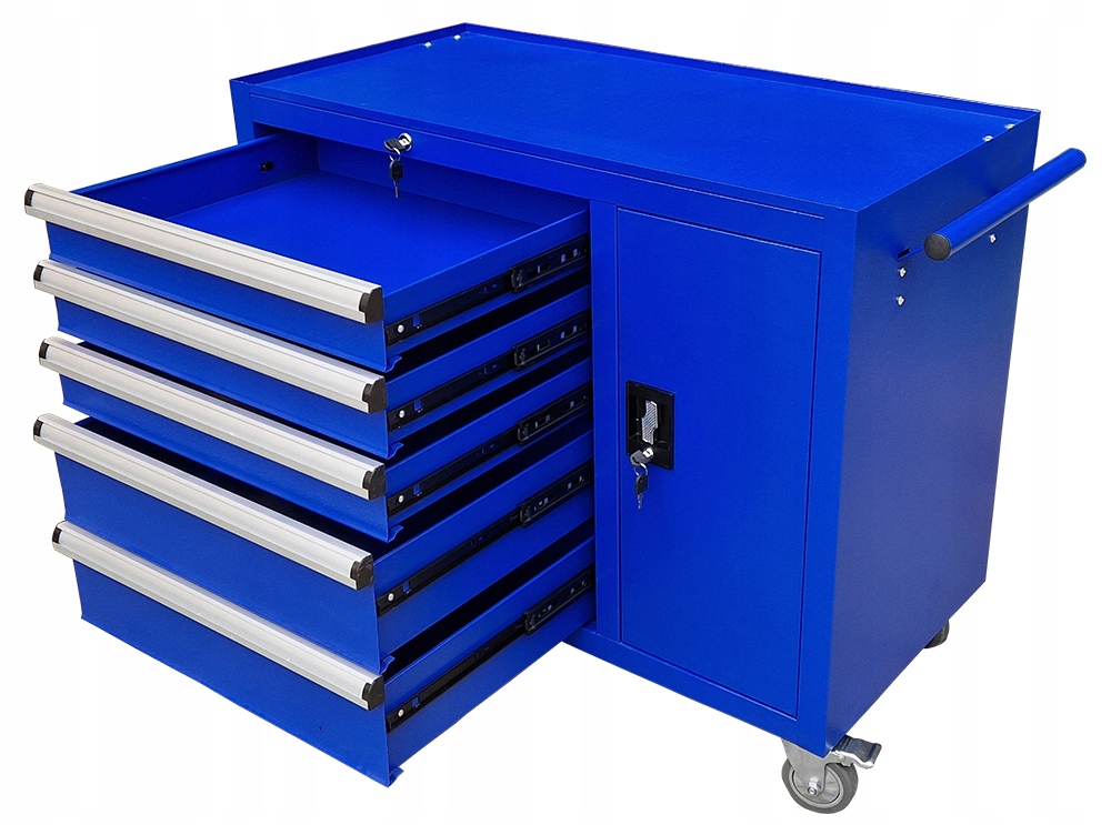 - Профессиональная тележка для мастерской включает в себя 5 ящиков на шариковых подшипниках и двухуровневый шкаф для хранилища, запираемого с помощью ключа.
