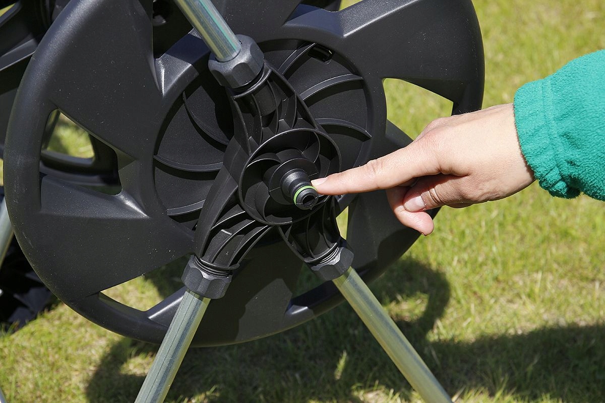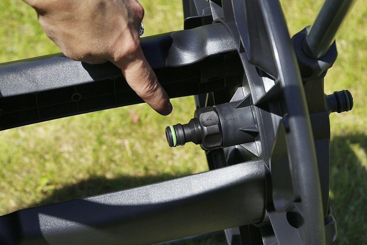 Предотвращает запутывание шланга и тем самым увеличивает его срок службы. Рукоятка для наматывания шланга на барабан