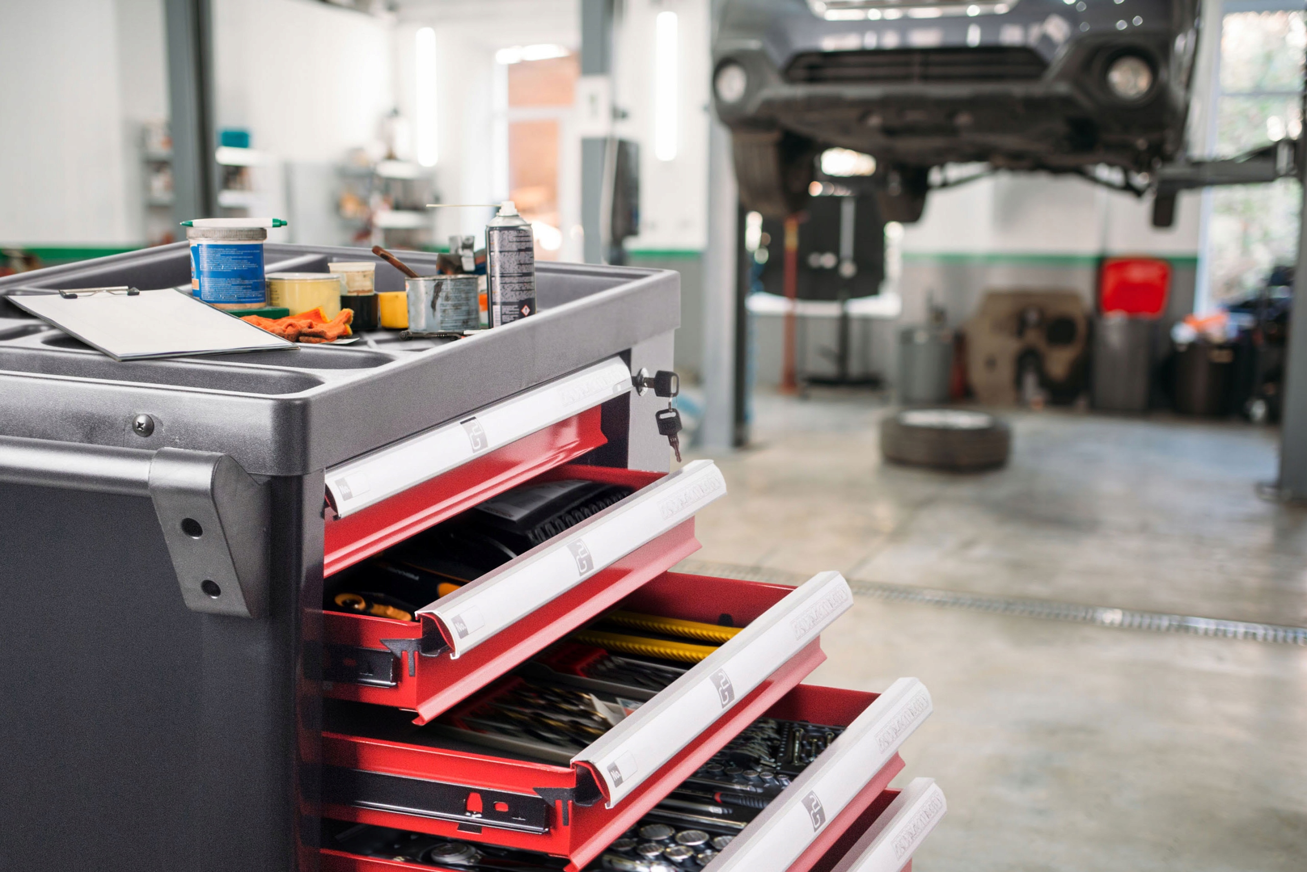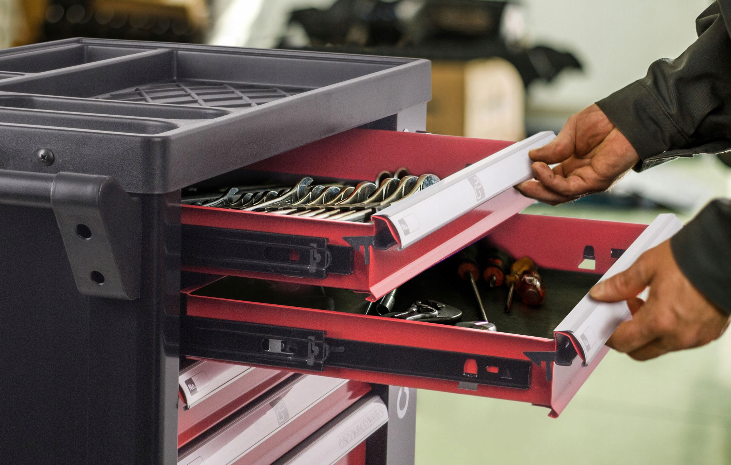 Вам не придется беспокоиться о том, что вы случайно откроете его во время движения — все ящики на месте. оснащен предохранителем, предотвращающим нежелательное открытие. Для большей сохранности хранящихся инструментов предусмотрена тележка для мастерской. Мы также оснастили его центральным замком для ящиков и замком для бокового шкафа.