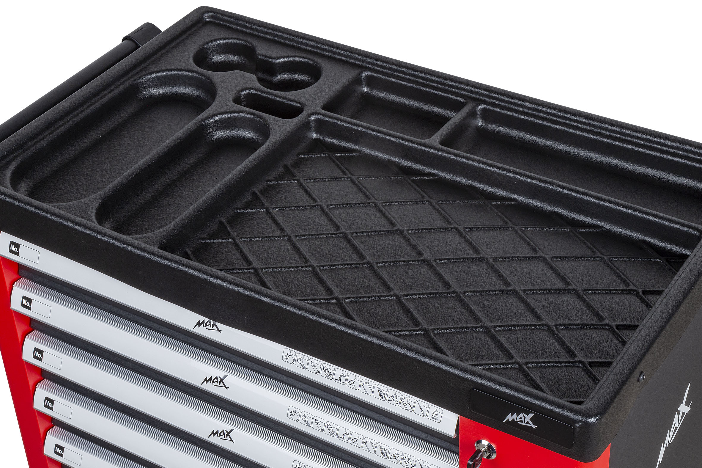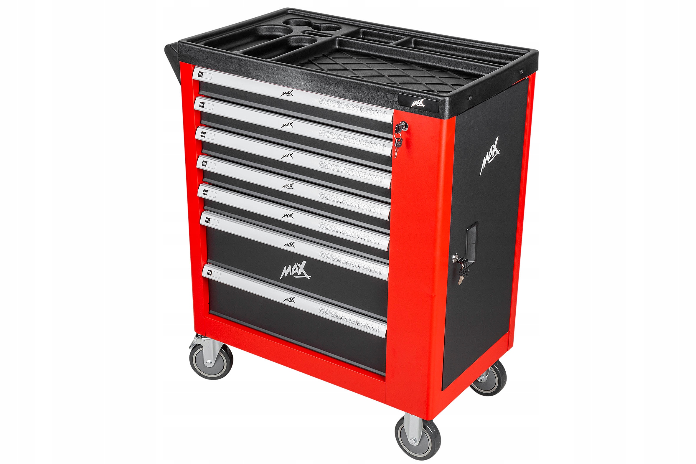 Тележка для мастерской/шкаф для инструментов Max оснащена 7 прочными, полностью выдвижными ящиками, которые можно закрыть с помощью центрального замка. В четырех ящиках вы найдете набор из 156 практичных инструментов, тематически расположенных и отмеченных соответствующим образом. Остальные три ящика мы можем использовать для хранения собственных инструментов; мы можем легко разместить там, например, дрели, отвертки, ударные гайковерты или другое оборудование, которое мы хотим иметь в одном месте.