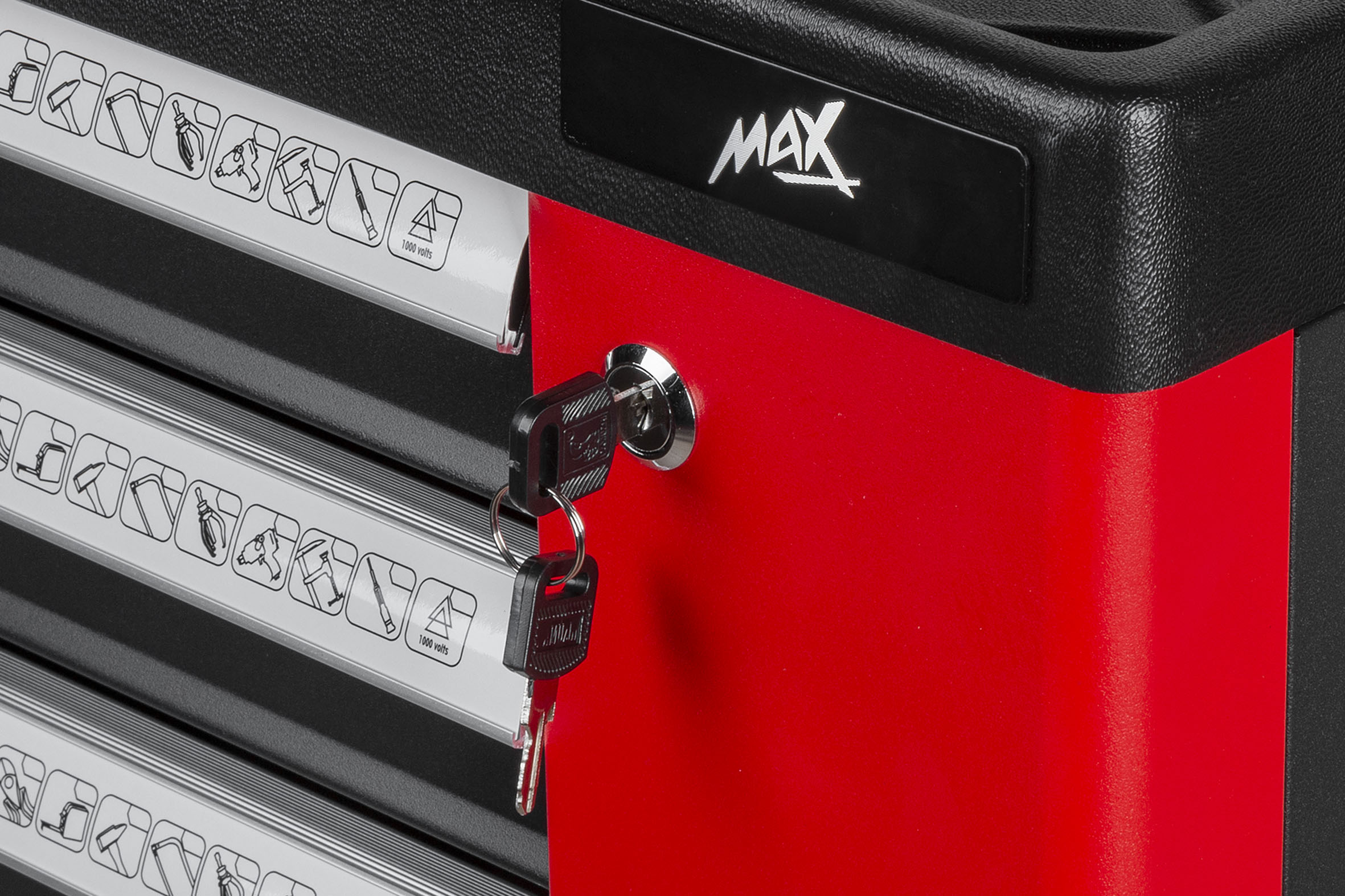 Тележка для мастерской/шкаф для инструментов Max оснащена 7 прочными, полностью выдвижными ящиками, которые можно закрыть с помощью центрального замка. В шести ящиках вы найдете набор из 234 практичных инструментов, тематически расположенных и отмеченных соответствующим образом. Последний большой ящик можно использовать для хранения других инструментов; мы можем легко разместить там, например, дрели, отвертки, ударные гайковерты или другое оборудование, которое мы хотим иметь в одном месте.