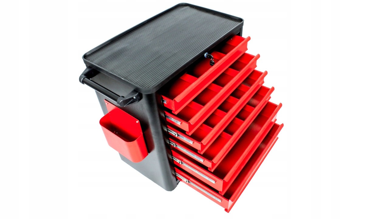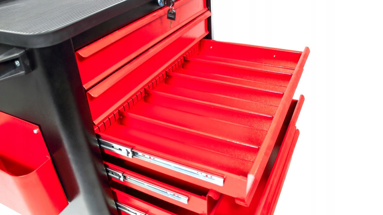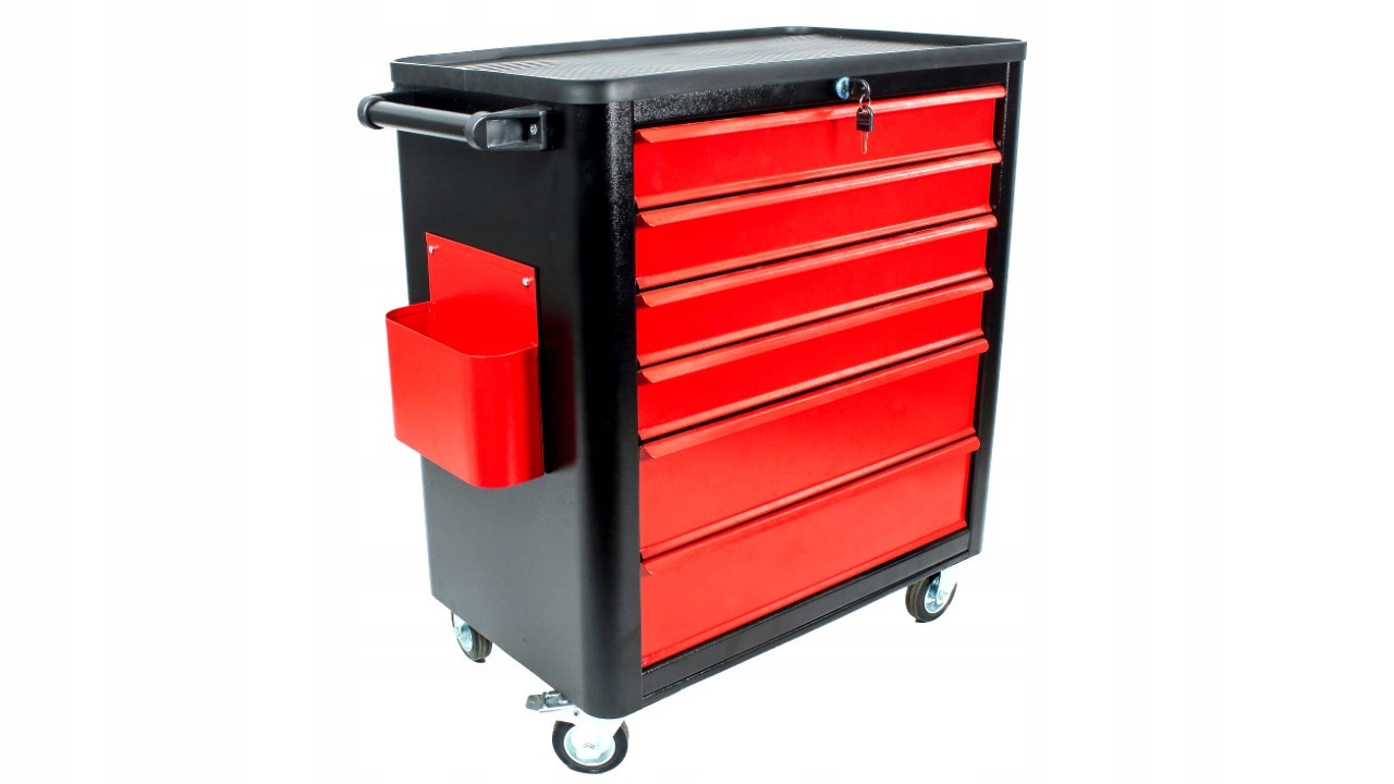 Металлическая тележка для мастерской WWTR6 представляет собой современный и функциональный верстак на колесах. Благодаря практичному решению и качественным колесам стол и инструменты всегда будут под рукой. Верстак на колесах может следовать за вами по всему рабочему пространству. Вы можете разместить его в любом месте студии, где вам это нужно. Шесть вместительных выдвижных ящиков на телескопических направляющих и дополнительные отделения для документов позволят хранить в чистоте и порядке всевозможные инструменты, шурупы и другие элементы, которые вы используете во время работы. Столешница станет удобным местом для работы, а удобная ручка позволит легко перемещать мастерскую тележку по студии.