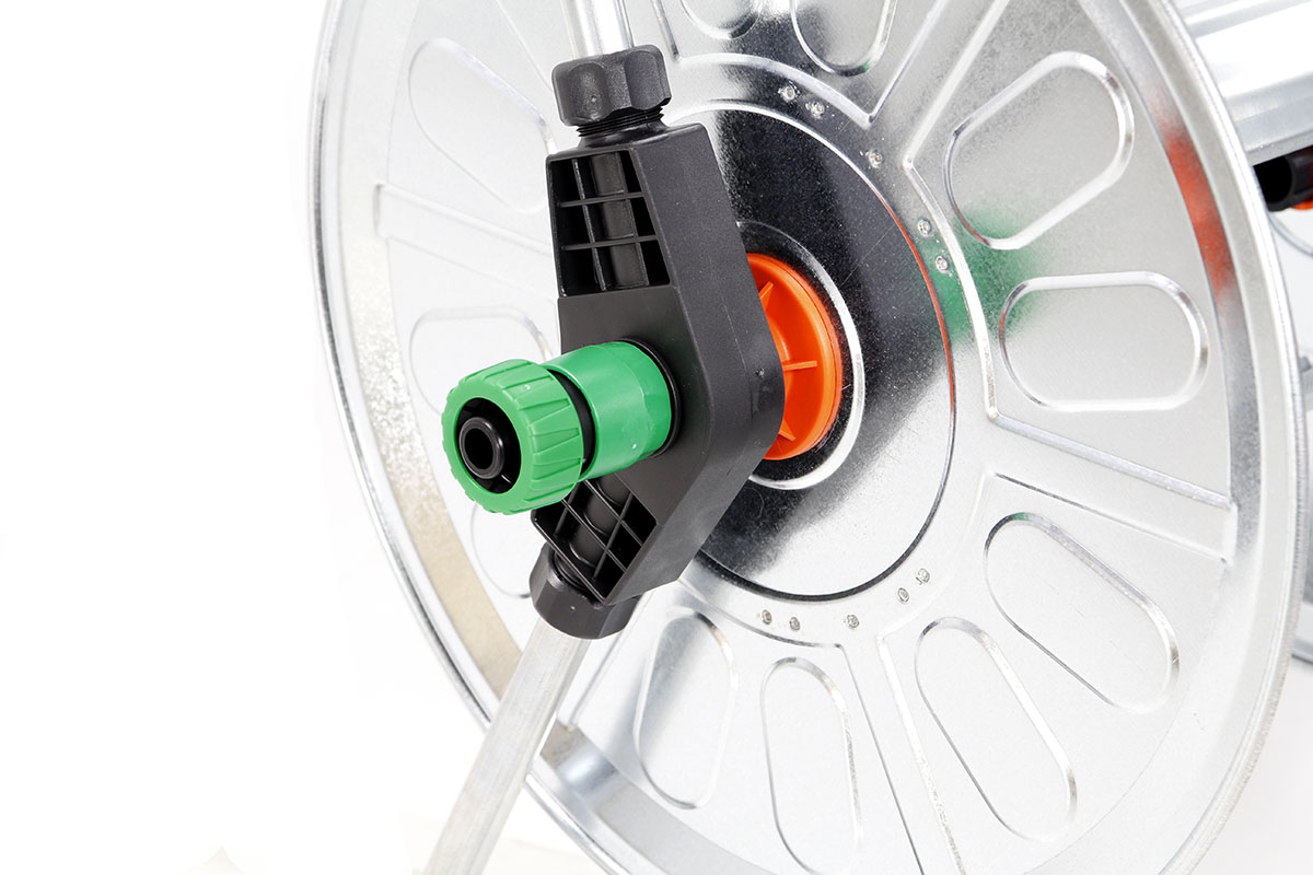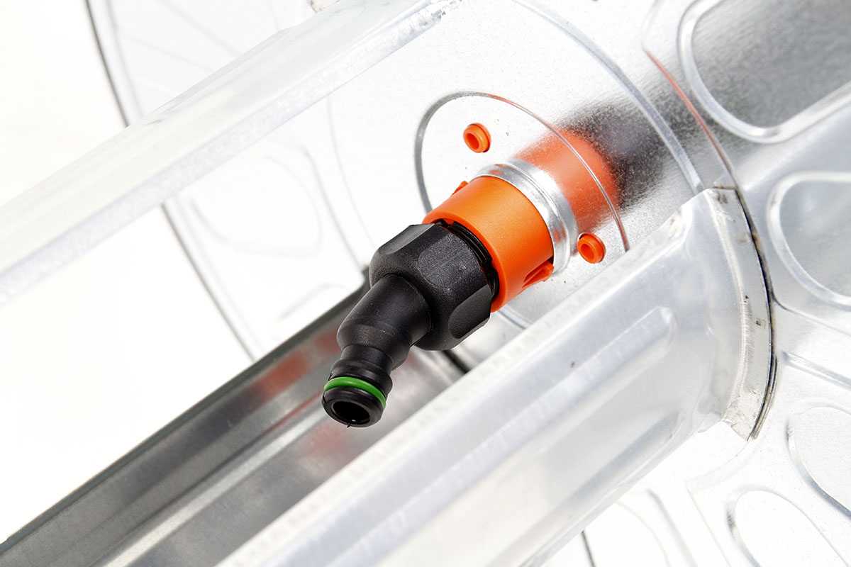 Поворотное соединение предотвращает перекручивание соединительного шланга при разматывании и перемотке основного шланга.