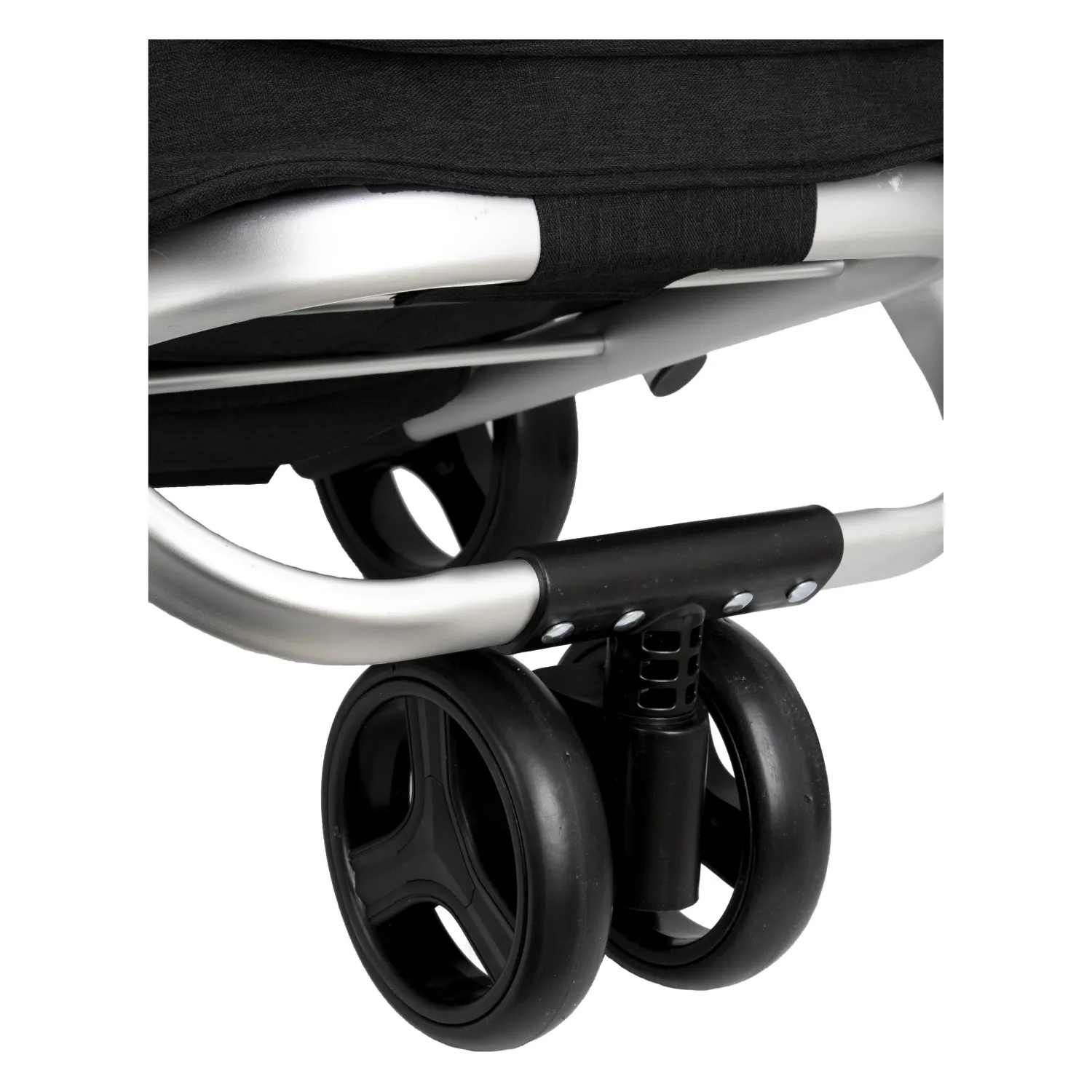 Бесшумные, большие задние колеса на шарикоподшипниках оснащены тормозом, поэтому вы можете спокойно передвигаться в автобусе, трамвае или поезде.