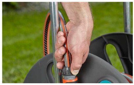Направляющая шланга на прочной металлической раме над барабаном обеспечивает равномерное сматывание шланга без необходимости придерживать его рукой. Просто поверните рукоятку на барабане.