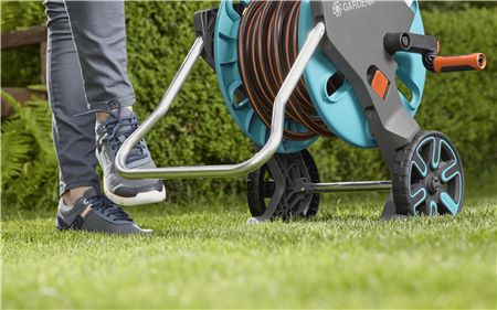 Особая форма опоры гарантирует отличную стабилизацию. Это облегчает полив, поскольку тележка не двигается, даже когда вытянут шланг.