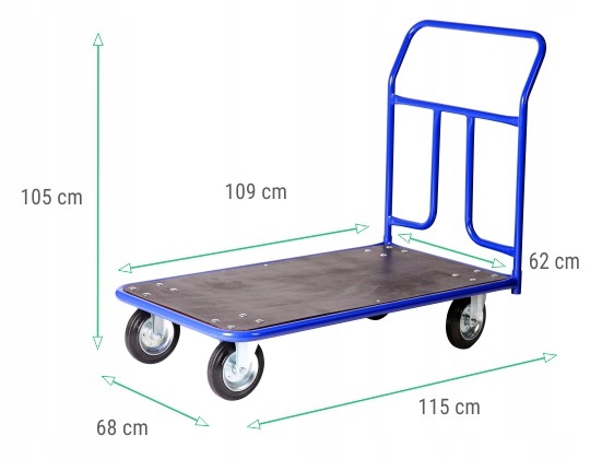 Прочная тележка-платформа с прочной конструкцией, облегчающая транспортировку тяжелых грузов. Удобная ручка и два поворотных задних колеса делают управление коляской чрезвычайно простым.